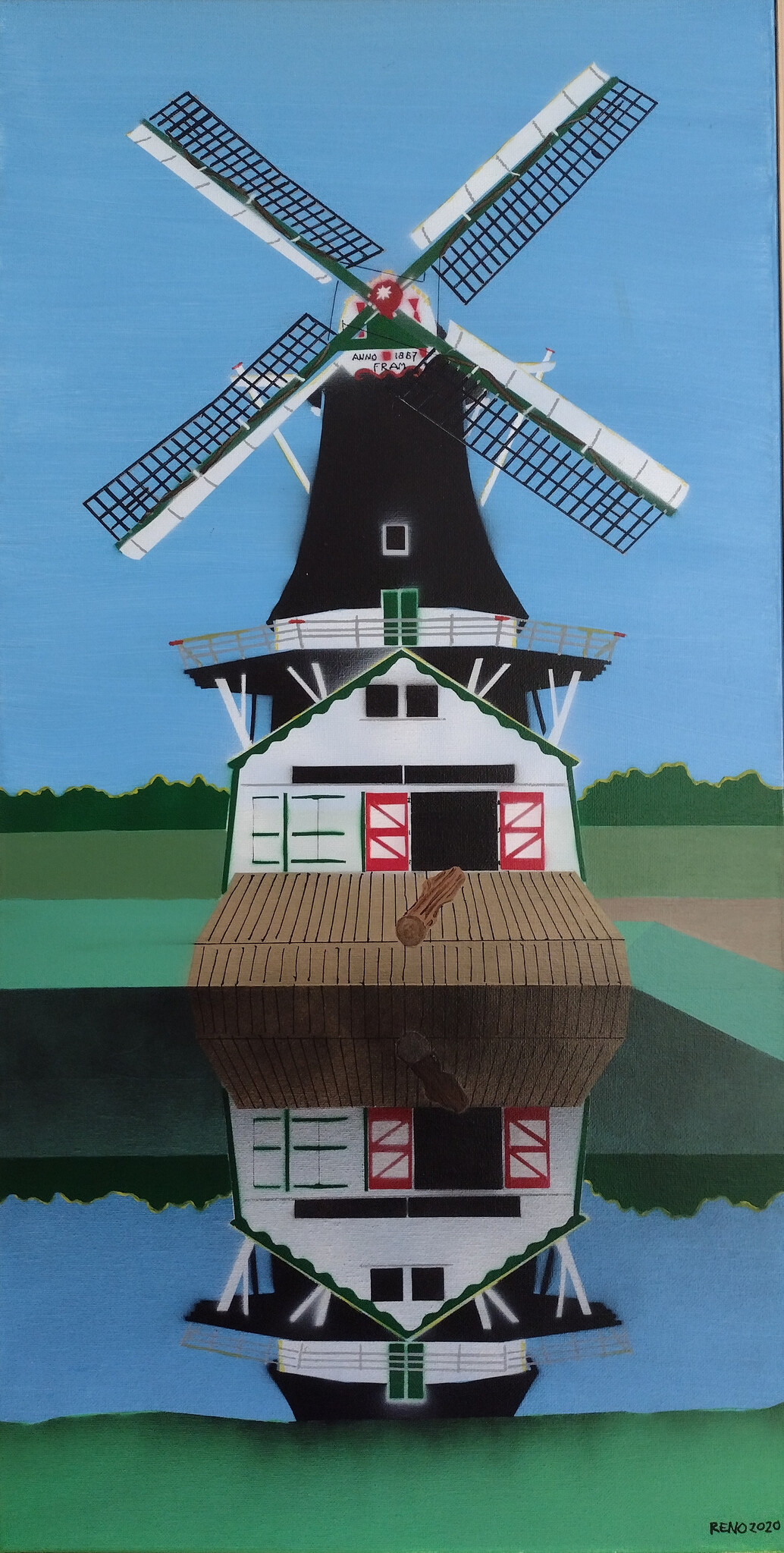 Zaagmolen Fram in Woltersum. Acryl en spuitbus op doek.
