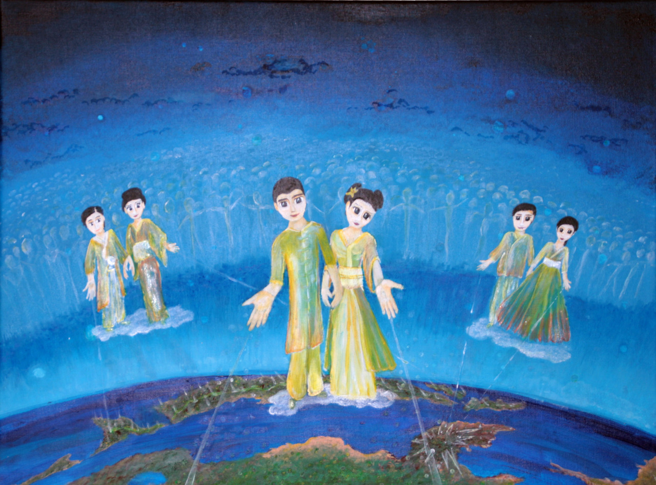 engelen boven japan, china en korea in traditionele klederdracht uit het desbetreffende land. engelen in de oosterse schildertraditie hebben geen vleugels maar lopen op wolken. zij brengen wit neutraal licht en liefde in de regio waar dat nodig mocht zijn. laat er liefde zijn in verscheidenheid van culturen.