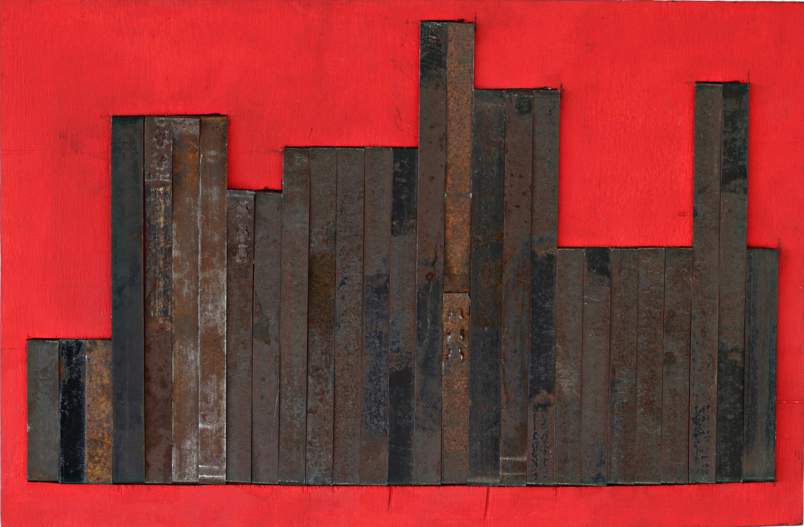Wandobject uit metalen strippen op multiplex met acryl