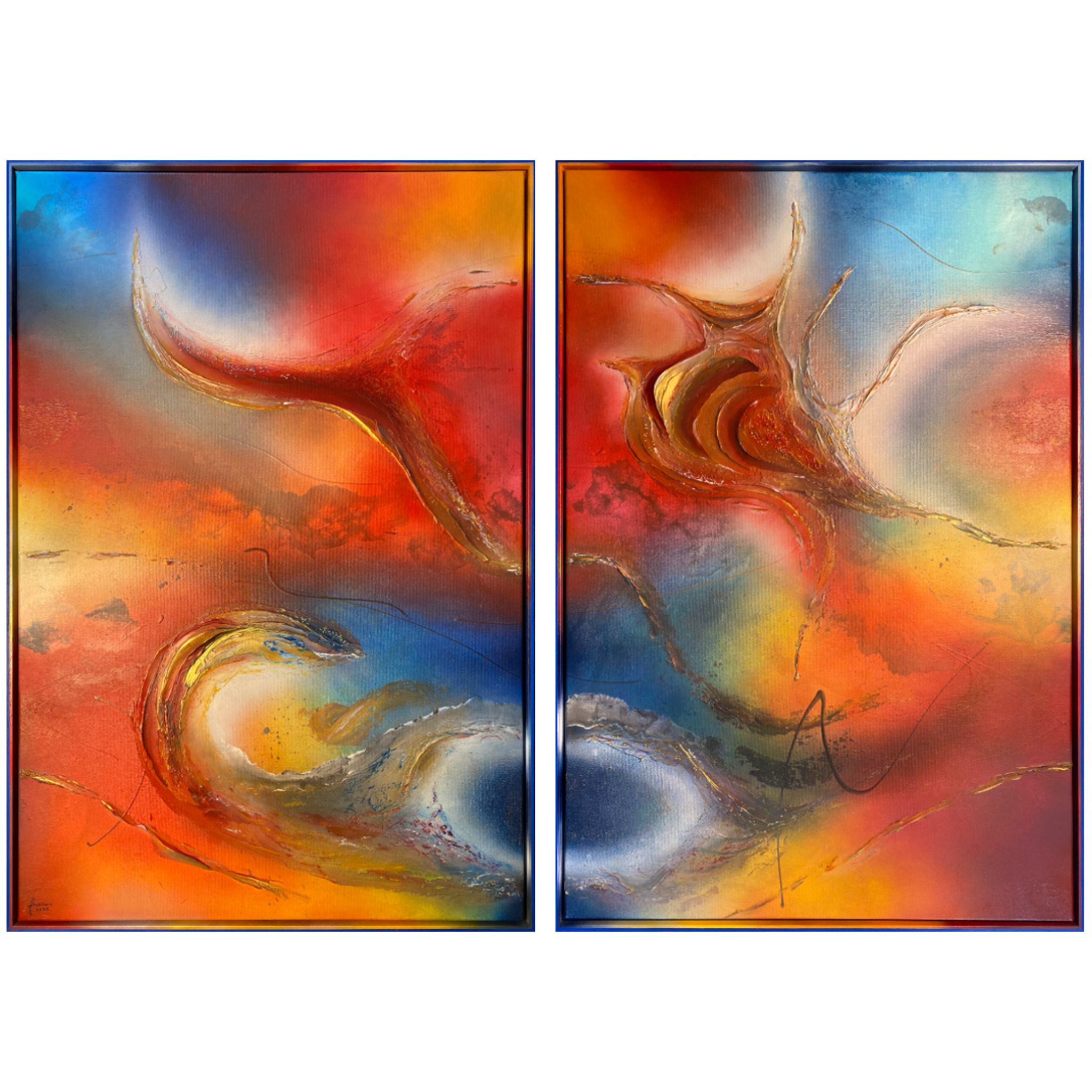 Ik maakte deze schilderijen voor een interessant echtpaar uit Israël, dat eerder in Singapore had gewoond en net naar Nederland was verhuisd. Tijdens het schilderen dacht ik aan hun avontuurlijke leven, de reizen die ze maakten, de reizigers (“voyagers”) die ze waren. Het zette een gedachtegang in gang over reizigers en leidde me naar de twee interstellaire robotsondes, Voyager 1 en Voyager 2, die in 1977 werden gelanceerd. De 2 sondes moesten in de buurt van Jupiter en Saturnus vliegen terwijl ze gegevens verzamelden. Na de lancering werd besloten om Voyager 2 richting Uranus en Neptunus te sturen. Ik stelde me voor wat die Voyagers zouden zijn tegengekomen, en nog zullen tegenkomen op hun reis, aangezien de Voyagers momenteel nog steeds in bedrijf zijn voorbij de buitenste grens van de heliosfeer in de interstellaire ruimte. Wauw, het gaf me zoveel inspiratie voor een levendig gekleurde reeks schilderijen die verder reikten dan het formaat van het canvas, tot in en door de schilderijlijst. Beide schilderijen kunnen in verschillende volgorde worden gecombineerd, met behoud van hun harmonie en met toch een ander uitstraling en ervaring. En wie goed kijkt, ontdekt de namen van de menselijke reizigers in deze 2 schilderijen. Mixed media on canvas, 83cm x 123cm x 4cm. Zie video impressie Meer foto's en informatie