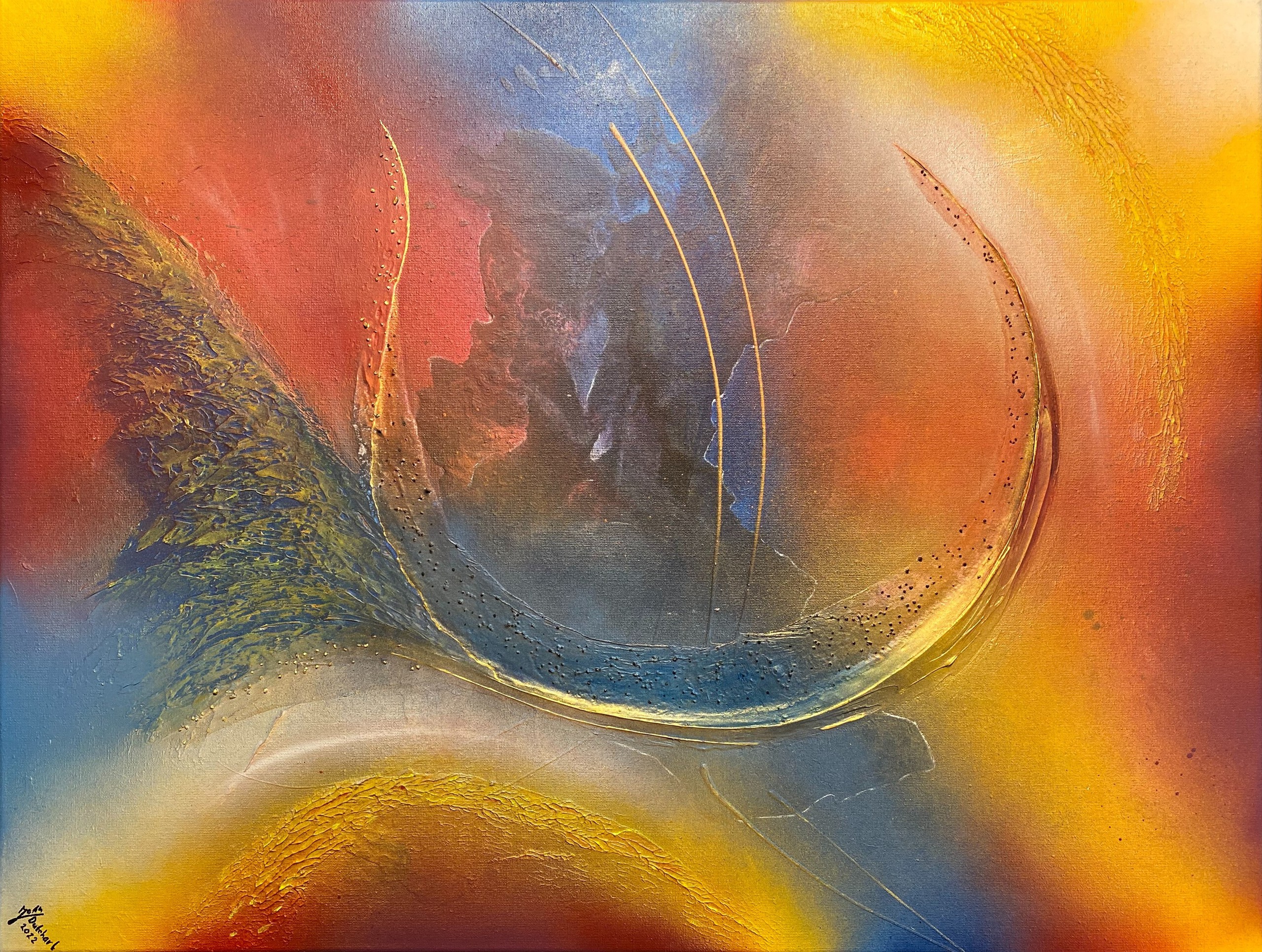 Geïnspireerd op twee robotachtige interstellaire sondes, Voyager 1 en Voyager 2, gelanceerd in 1977. De Voyager-sondes waren aanvankelijk bedoeld om alleen in de buurt van Jupiter en Saturnus te vliegen terwijl ze gegevens verzamelden voor transmissie naar de aarde. Na de lancering werd besloten om Voyager 2 in de buurt van Uranus en Neptunus te sturen om gegevens te verzamelen. Voyager 1 werd gelanceerd na Voyager 2, maar langs een kortere en snellere baan die was berekend om een optimale flyby van Saturnusmaan Titan te bieden. Ik vraag me af hoe de reis van Voyager 1 was, hoe hij de ruimte zag, hoe hij Titan zag. Hoe, in verschillende spectra, elektromagnetische straling zich zou vertalen in kleuren en hoe levendig en harmonieus deze kleuren zouden zijn. Enkel mijn voorstelling en fantasie, alleen maar beelden van gedachten, alleen gevoelens die transformeerden in vormen, structuren en levendige kleuren die zich uitstrekken buiten het canvas, bovenop en door het frame heen. Ik heb echt genoten van het maken van dit schilderij, opgezet in 8 verschillende, maar toch verbonden lagen. Opmerking: Passing Titan kan zowel horizontaal als verticaal worden opgehangen. Het schilderij wordt geleverd inclusief een houten omlijsting waarin de kleuren van het schilderij doorlopen bovenop de lijdt en in de zijkant. zie Schilderij "Passing Titan" inclusief luxe lijst