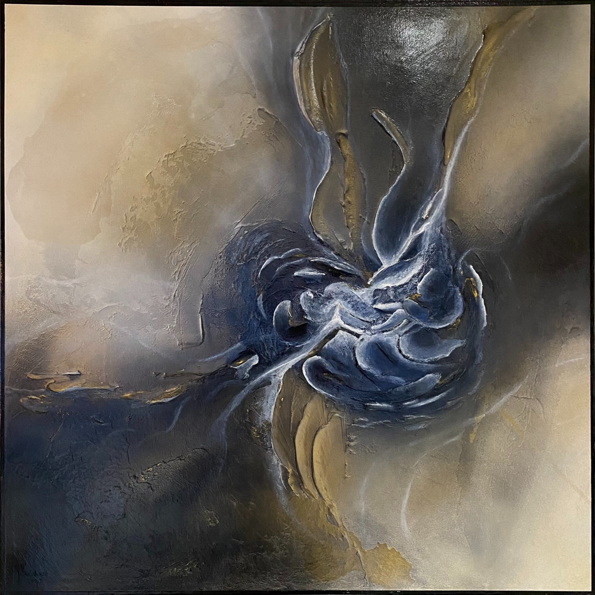 Geïnspireerd door de prachtige natuur die ik zag tijdens mijn reis naar Sicilië, op en rondom de Etna. De Etna is een van 's werelds grootste en meest actieve vulkanen en domineert het Siciliaanse landschap. Ze heeft een overweldigende aanwezigheid, met veel intense kleuren die ze in overvloed laat zien. De Sicilianen noemen haar Mungibeddu of Mongibello in het Italiaans, wat prachtige berg betekent. En mooi is ze. Tijdens het schilderen van dit kunstwerk werd ik vooral beïnvloed door de vormen en kleuren van de witte dunne wolken tegen de blauwe lucht en de vorm en grijsachtige kleuren van de ooit roodgloeiende lava. Tussen de grijze lavasteen zaten nog wat resten, strepen, van sneeuw. Ook al was het al september. In de kegels van de Etna was er een palet van bruine, beige bijna gele kleuren stenen en rotsen. Prachtig contrasterend met het grijs. Ik vond deze kleurencombinatie schitterend en paste het toe in dit schilderij. Dit schilderij is goed te combineren met het andere schilderij op basis van dezelfde inspiratie; Mungibeddu deel I. Mixed media on wood 70x70x4cm