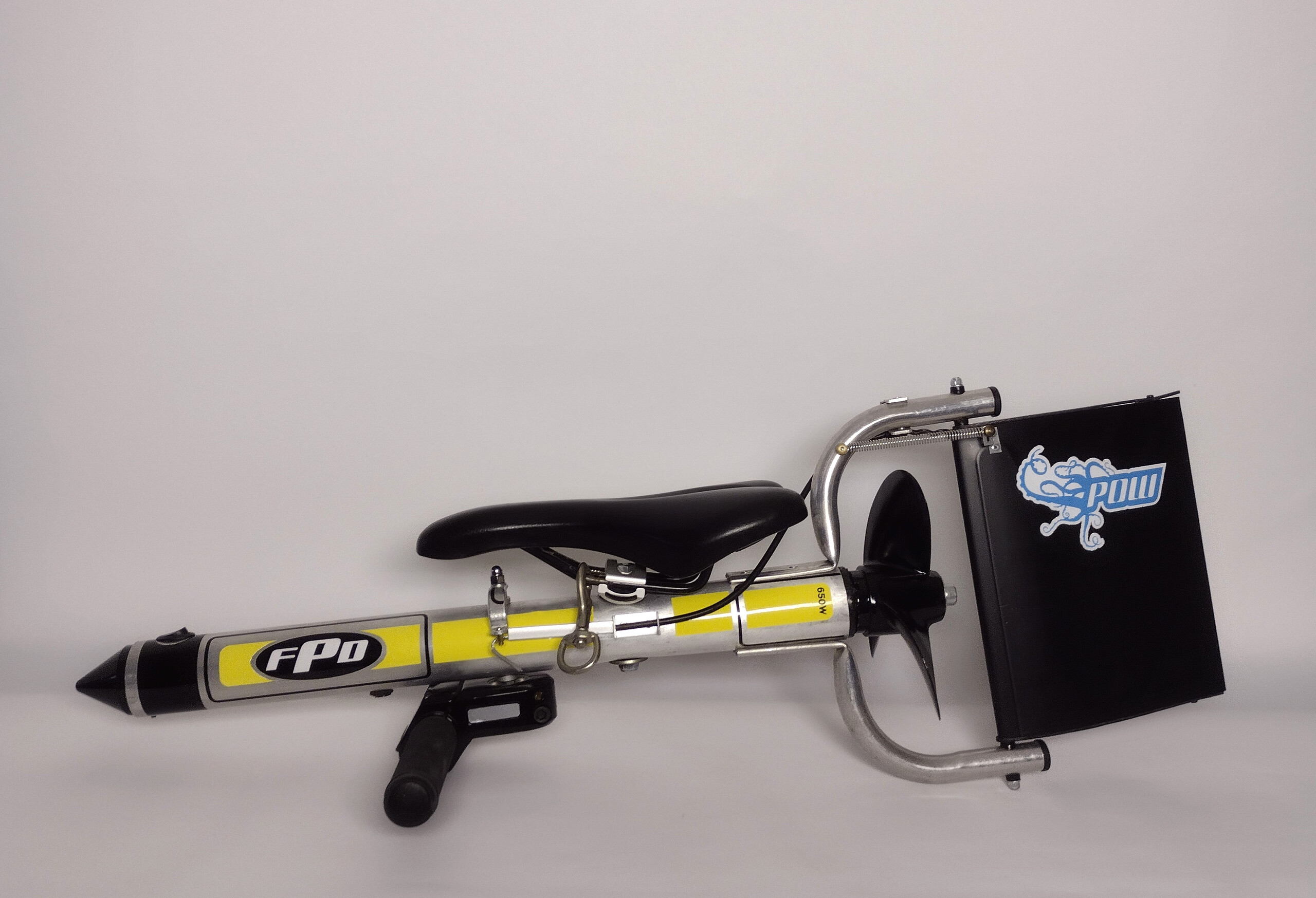 Levensgrote fantasie onderwaterscooter met een knipoog, gemaakt van hergebruikte materialen, met electromotor.
