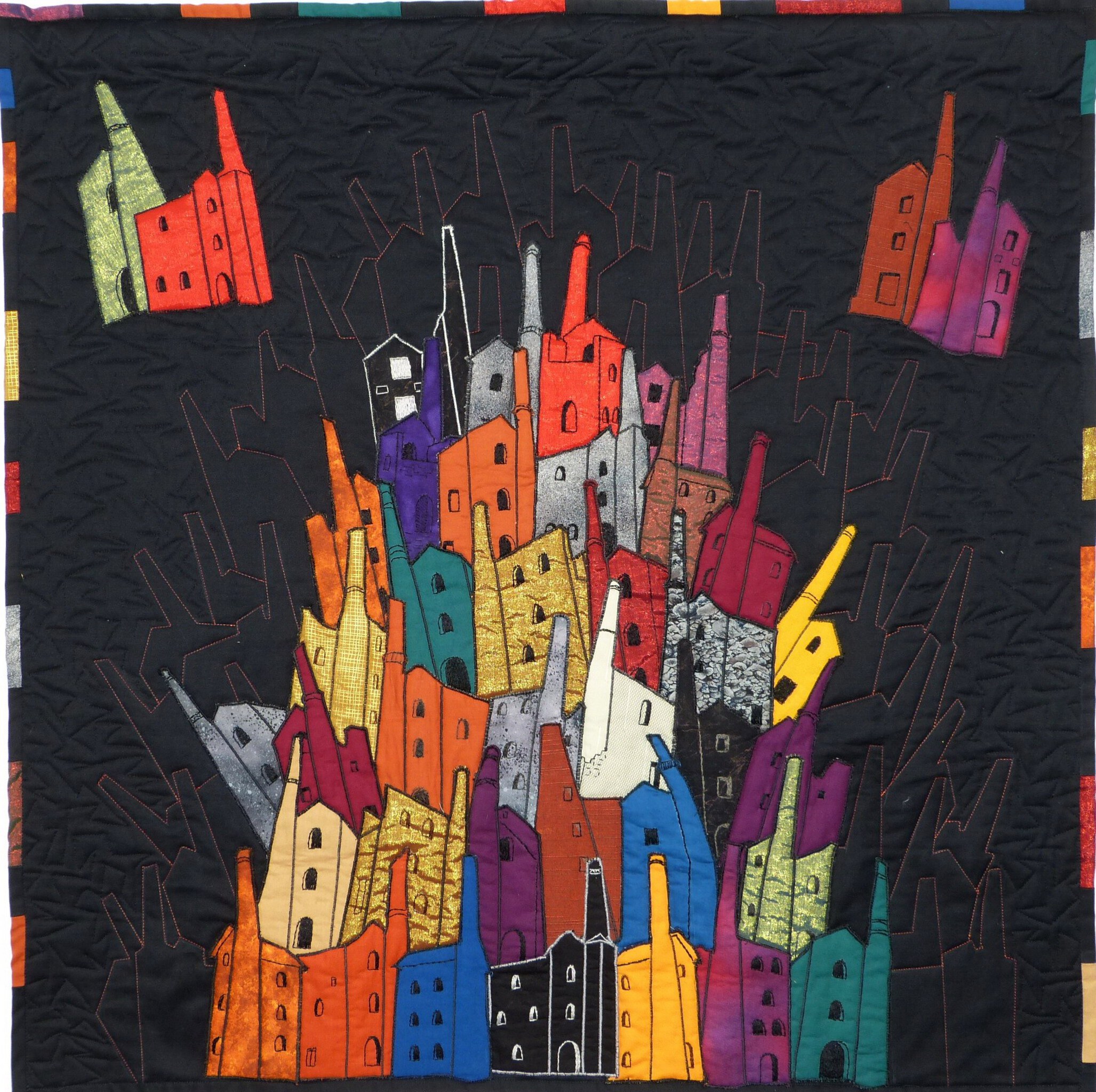 De vraag van keramiste Janneke Makkink was: Kun je een quilt maken zoals jij tegen mijn fabriekjes aankijkt. Na eindeloos piekeren heb ik al haar fabriekjes op 1 hoop "gegooid". Het is een heel kleurrijk geheel geworden. Veel met de hand geborduurd en met de machine doorgequilt. Een explosie van tin-fabriekjes uit Zuid-Engeland.