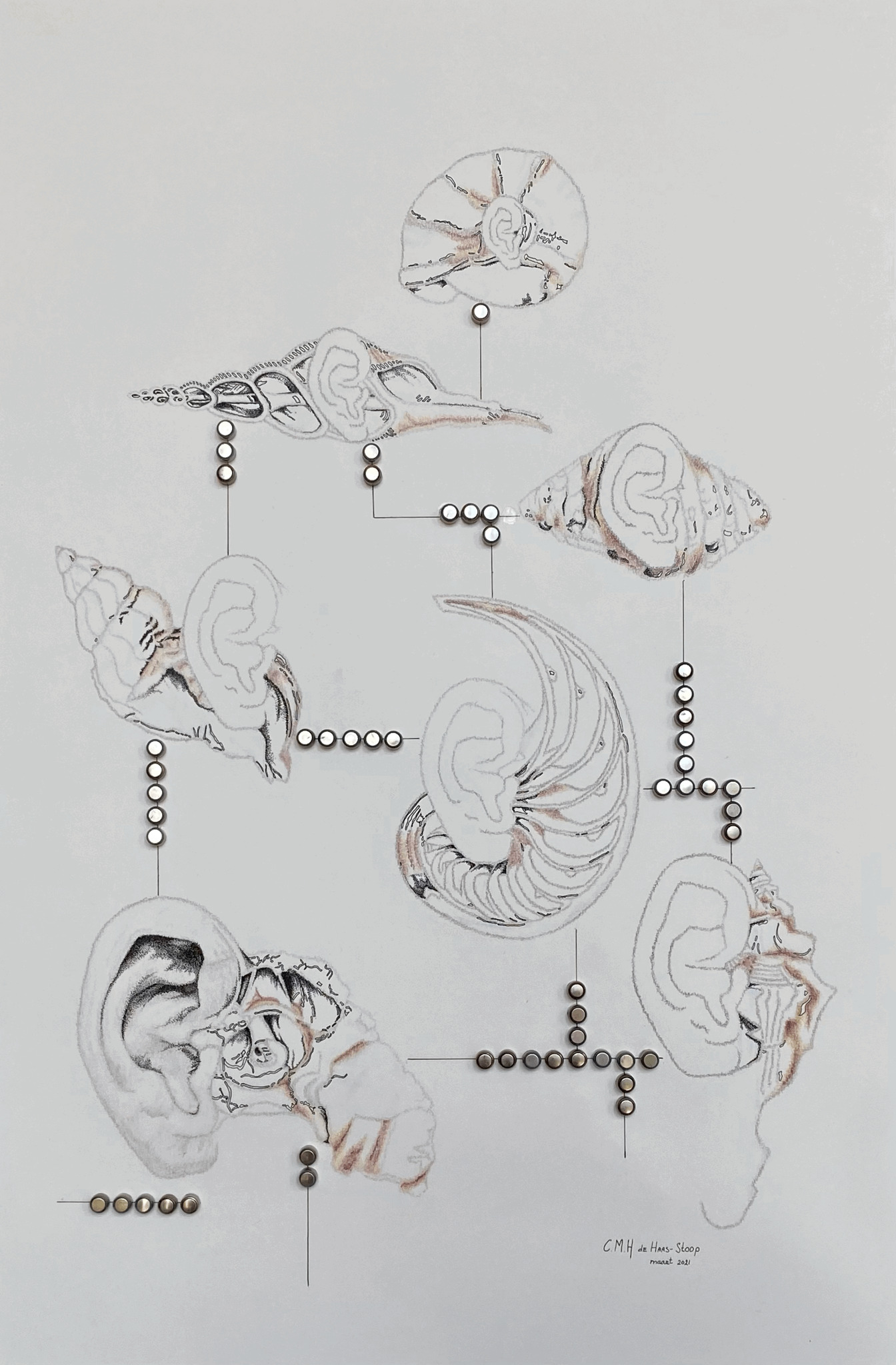 Tekening van oren aangevuld met batterijtjes uit gehoorapparaatjes