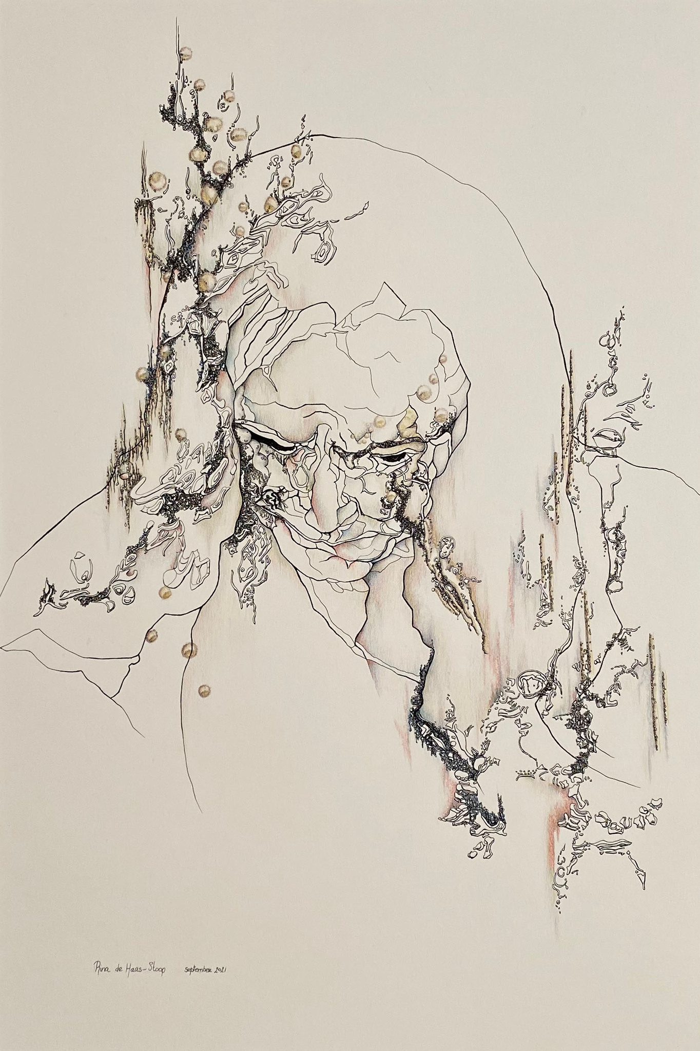 Rina de Haas, vormgeefster. Gespecialiseerd in portrettekenen met als uitgangspunt het verhaal áchter het portret. Mijn schriftuur is het opbouwen van het totale beeld met structuren uit de natuur.