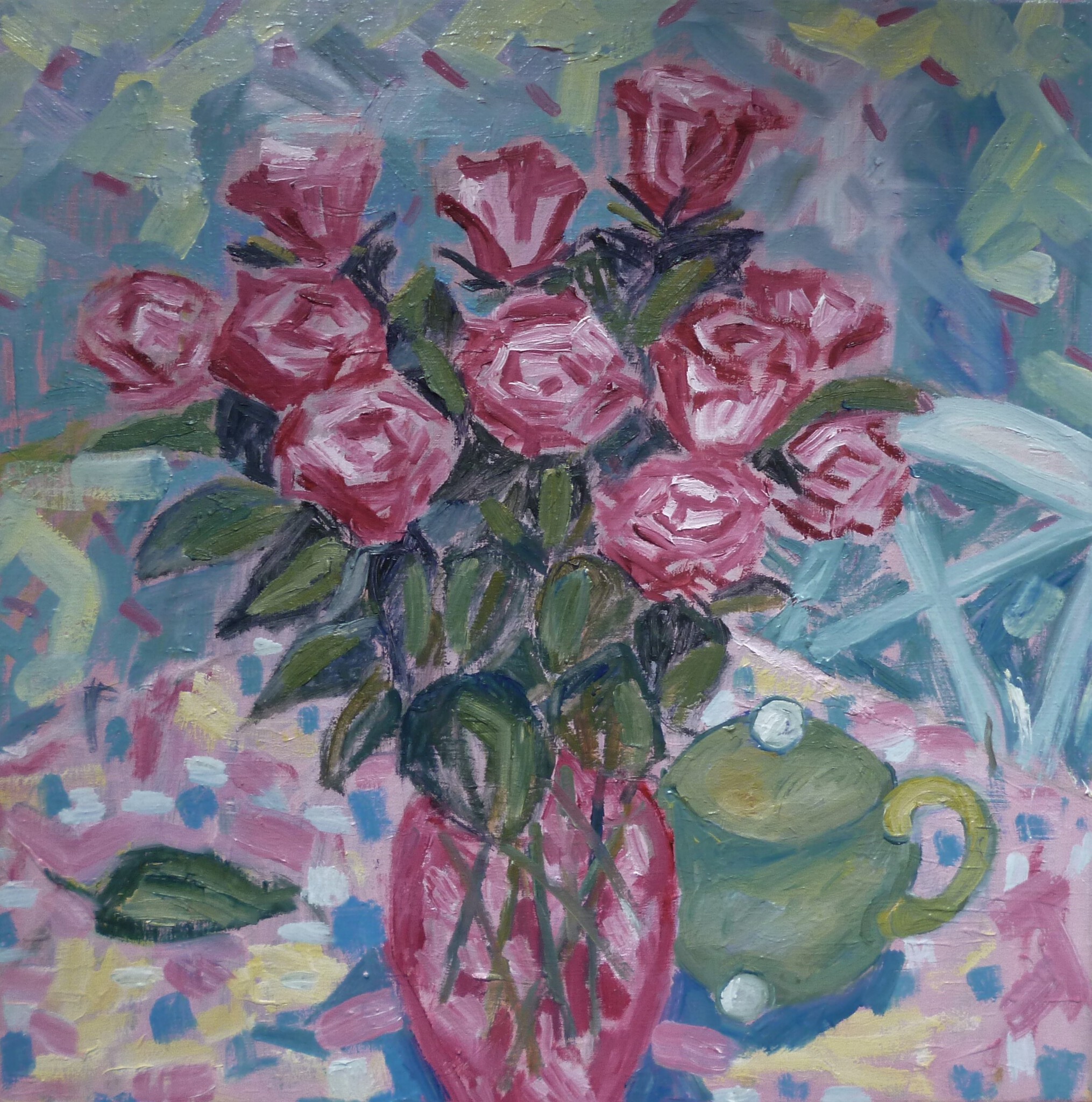 Stilleven met rose rozen en theepot.