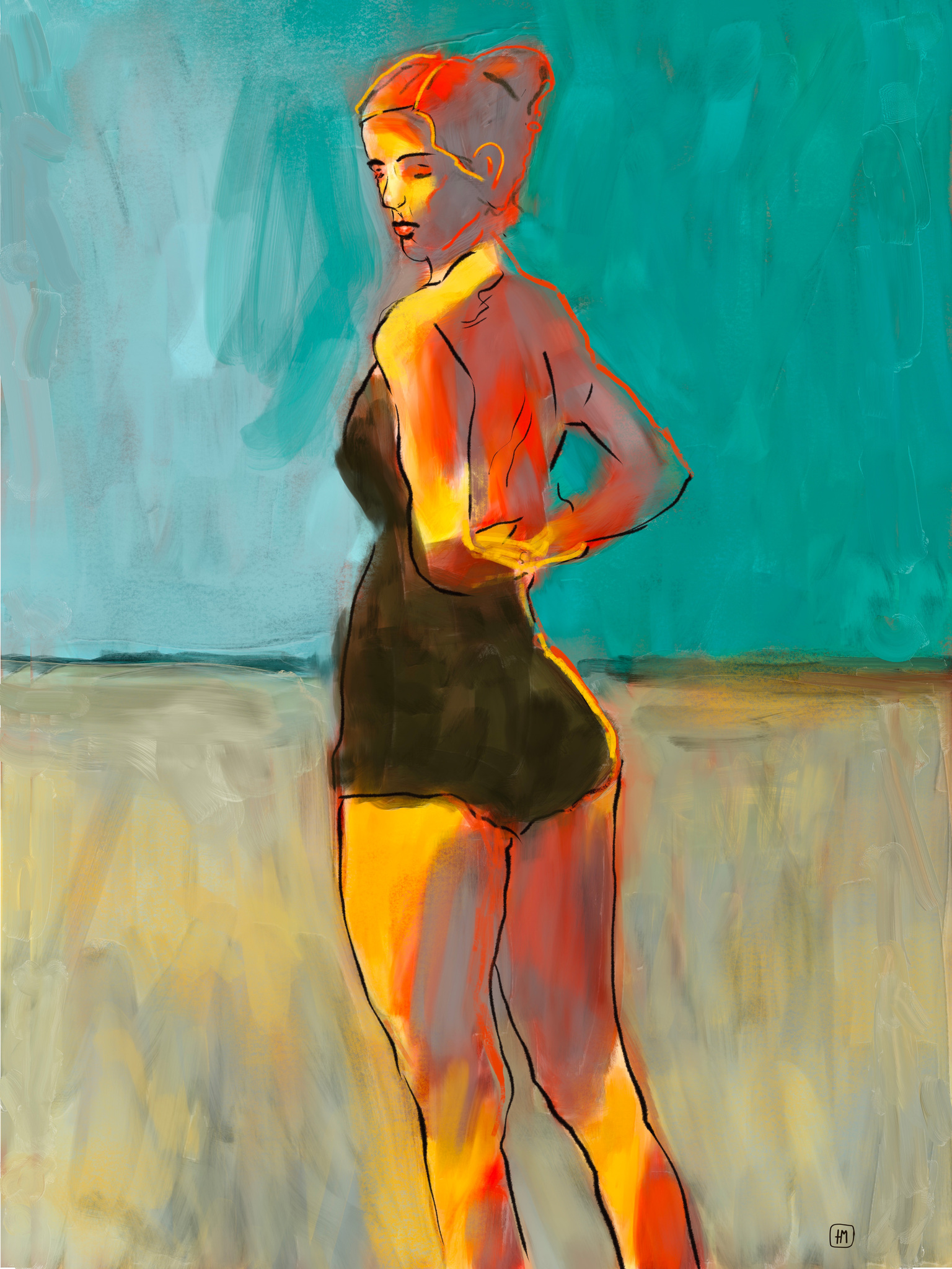 Modern schilderij van een vrouw in badpak, schilderij met rood en blauw