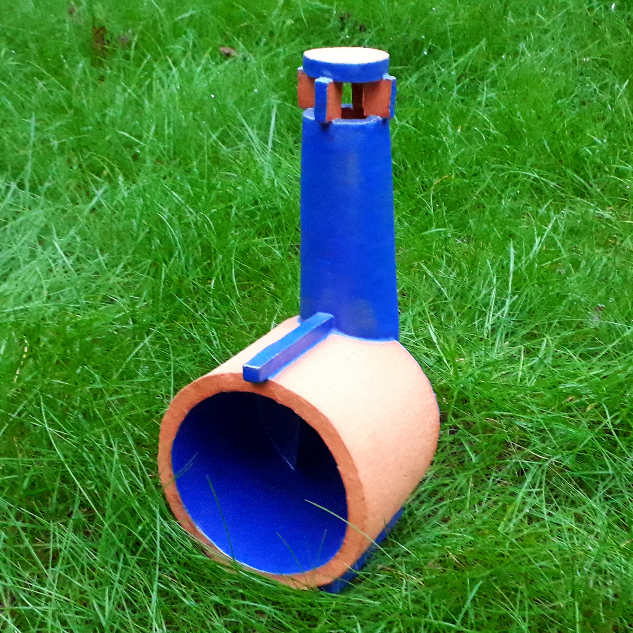 Onderdeel van een serie van een 10-tal waxine-oventjes. Allemaal in verschillende vorm, kleikleur en glazuur. Deze is in rode keli en blauw glazuur.