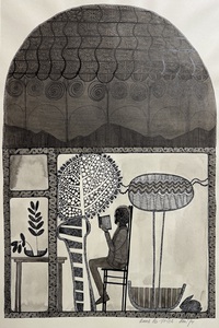 Wandplanken met originele rode kleur. Bewerkt met schuurschijf, priem en schuurpapier. Onderliggende verflagen (groen, crême) en blank hout zijn tevoorschijn gekomen. Kleuren groen, zwart, geel, goud en wijnrood met penseel toegevoegd. Twee figuren in lood op het hout getimmerd.