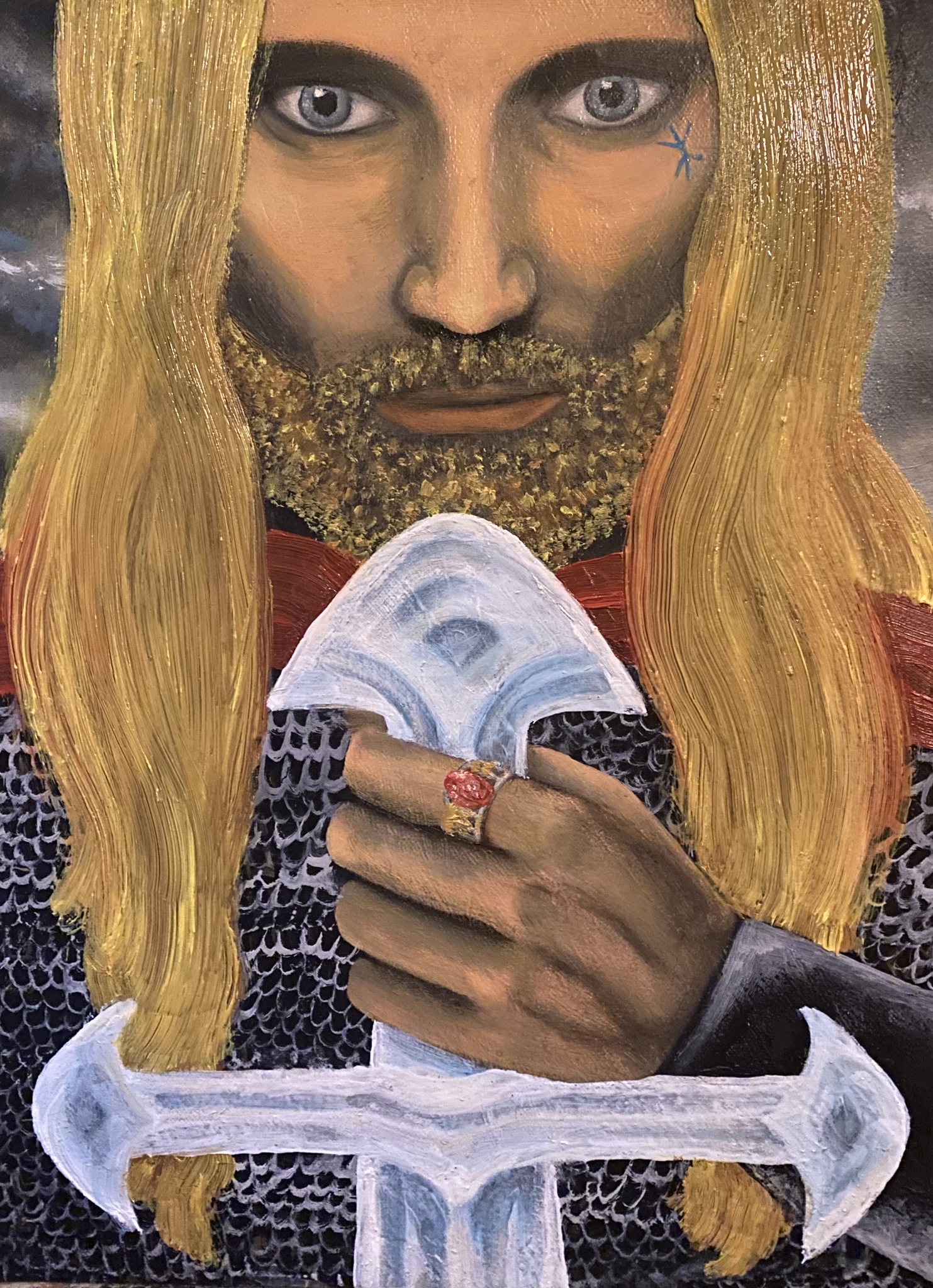 Harald Fairhair was a handsome Viking and the first king of Norway. When he was a young man, he fell in love with a princess named Ellisif. Getting rejected for not being important enough, Harald decided to make himself king of all of Norway to get her affection. He succeeded and became the first king to claim sovereignty over all Norway. Harald then married his love. He holds his Sword of Justice, wears a ruby ring, a symbol of monarchy and has a tattoo of a medieval rune on his cheek. It represents the letter H.