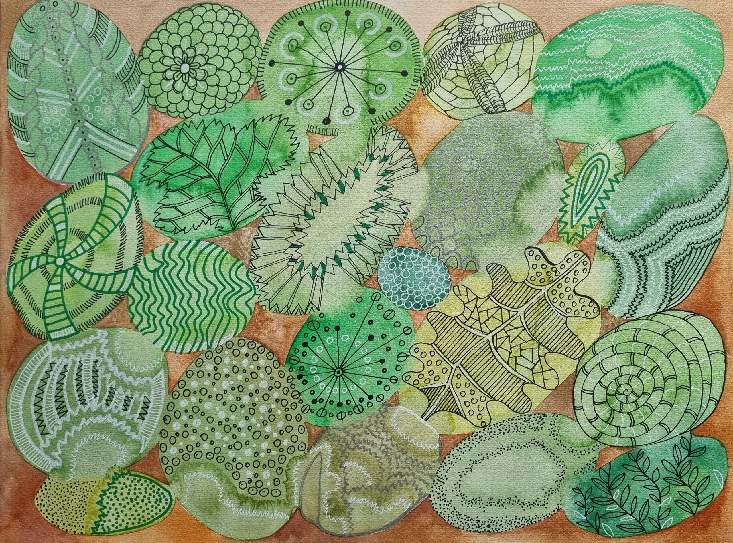 Groen Bruin Aquarel Fantasie Bladeren Vormen Stift Ovalen