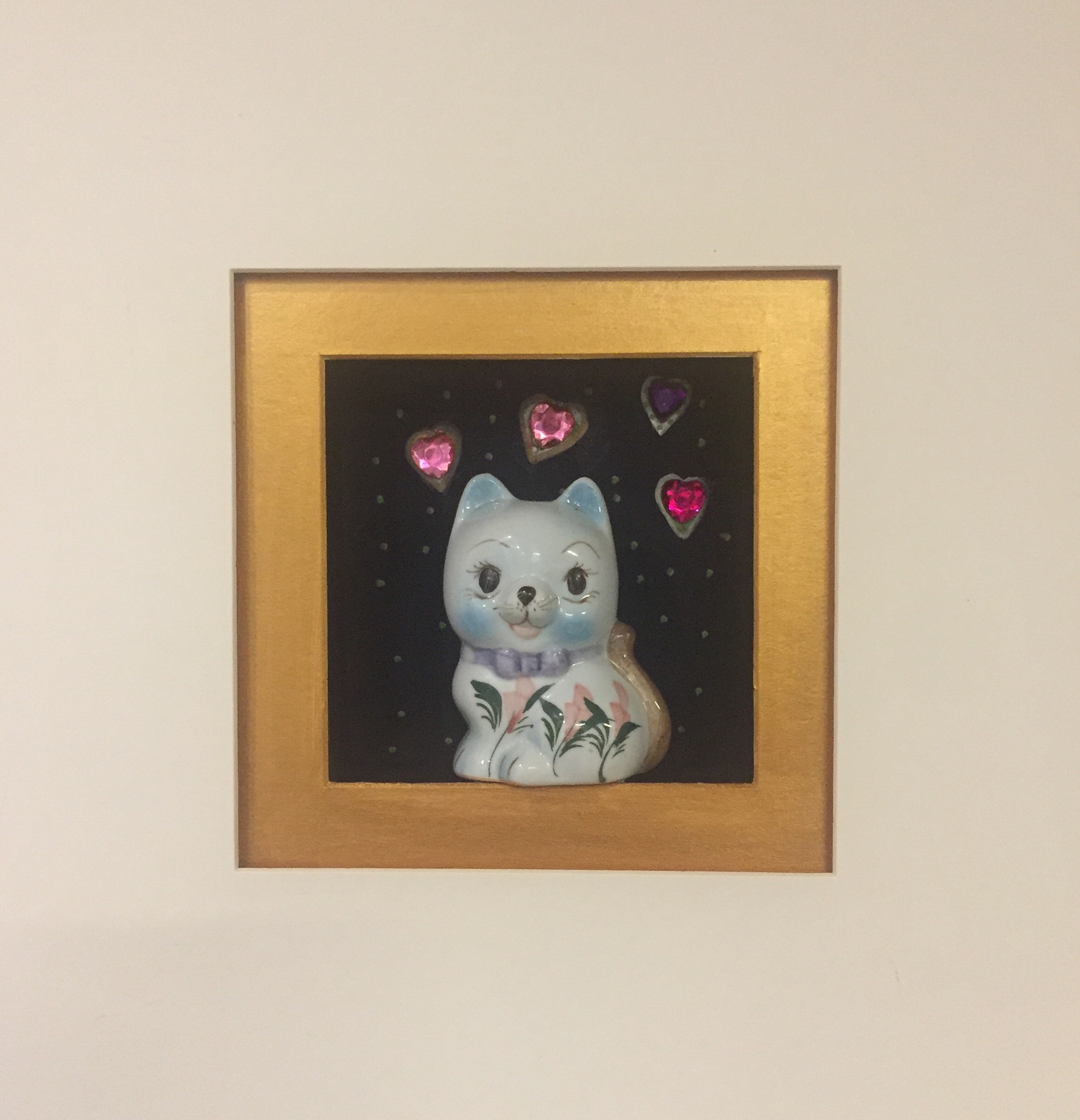 Een klein werkje met daarin een klein porseleinen katje.