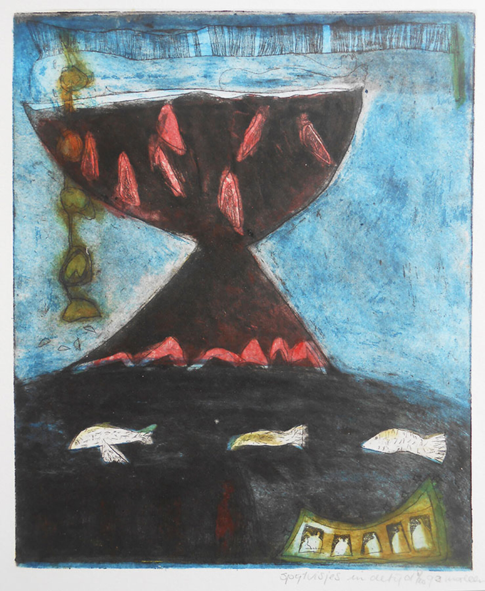 Deze ets ws een inzending bij een grafiekwestrijd van de Volkskrant en Het Bijbels Museum. het behoorde tot de tien genomineerde werkstukken en is aangekocht door Het Bijbeld Museum te Amsterdam. Ook door grafiekvakbond in Zweden.