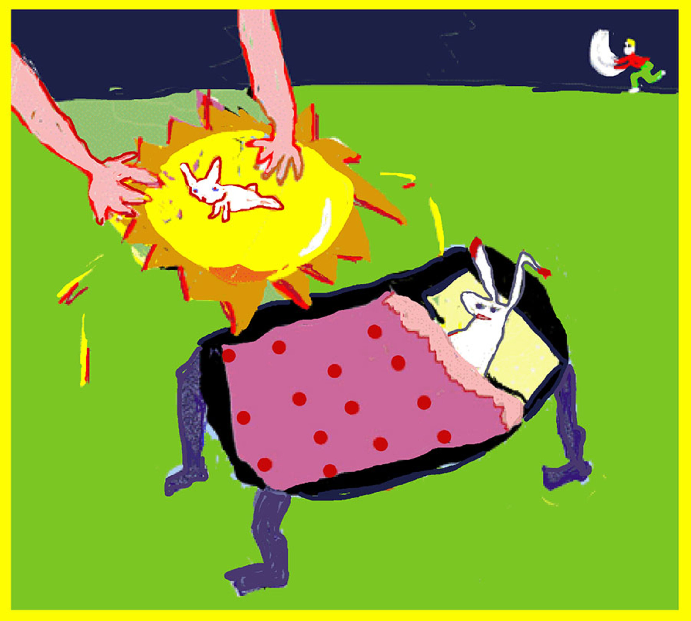Dit is een digitale illustratie. Bij een verhaal van konijn dat in zijn bed op reis is.