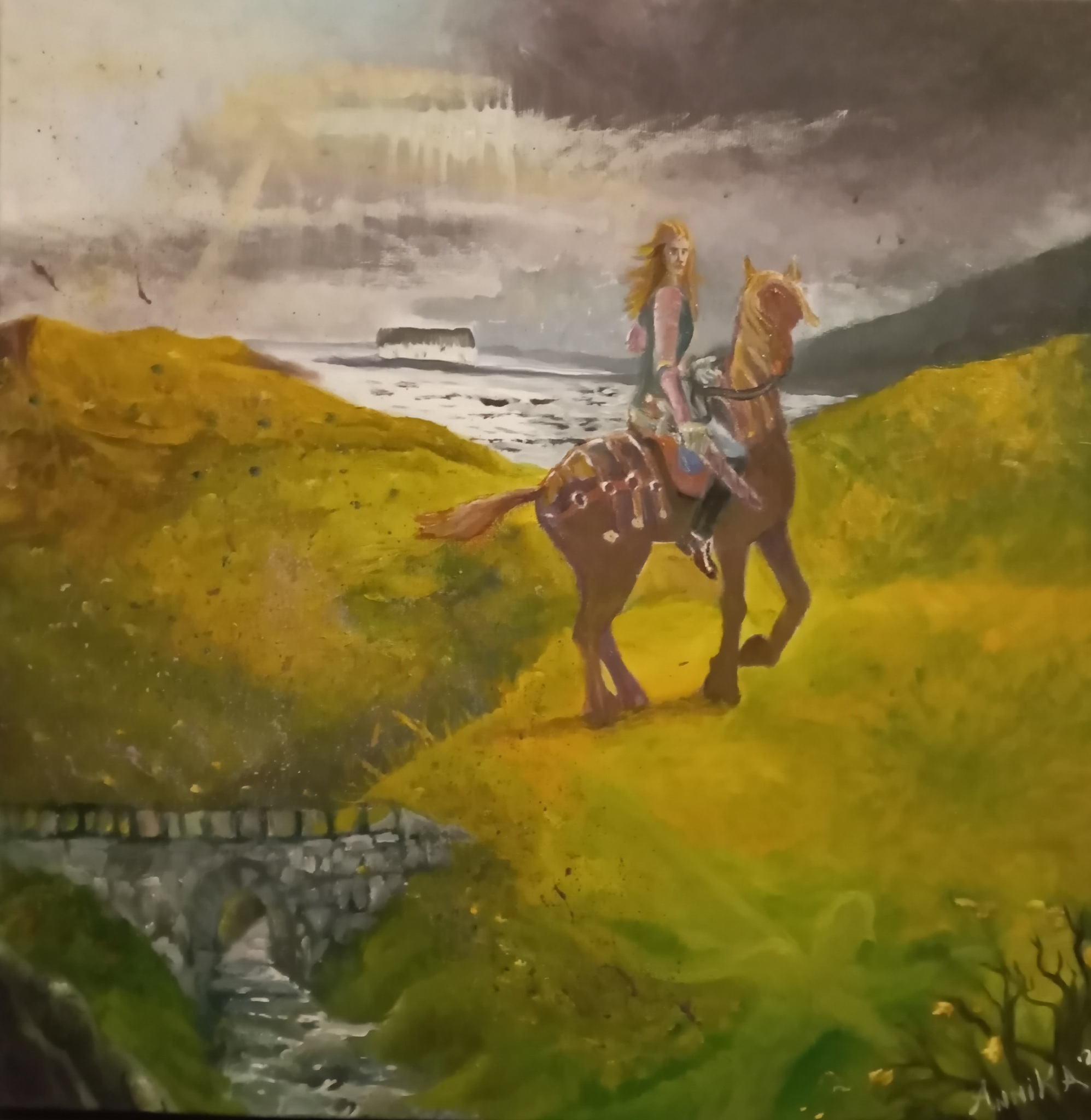 Oud en Nieuw Dit schilderij toont een Iers landschap en het zit vol met symboliek. Het gaat over een overgang van oud naar nieuw, met een brug die beide verbindt. Soms moet je alle moed verzamelen om de sprong naar het noodzakelijke nieuwe te wagen met je paard. Van tevoren weet je niet of het zal gaan stormen, wat de gevolgen zullen zijn. De storm zal ook dingen in beweging zetten, zoals blaadjes, stof en zaden. De zaden lijken te worden uitgestrooid door een bovennatuurlijk wezen met vleugels (engel), rechtsonder in het schilderij... en worden door de stormwind ver weg geblazen, om daar nieuw leven te scheppen. In de verte staat een huisje; dat kan een letterlijk nieuw thuis zijn of een gevoel van thuiskomen.