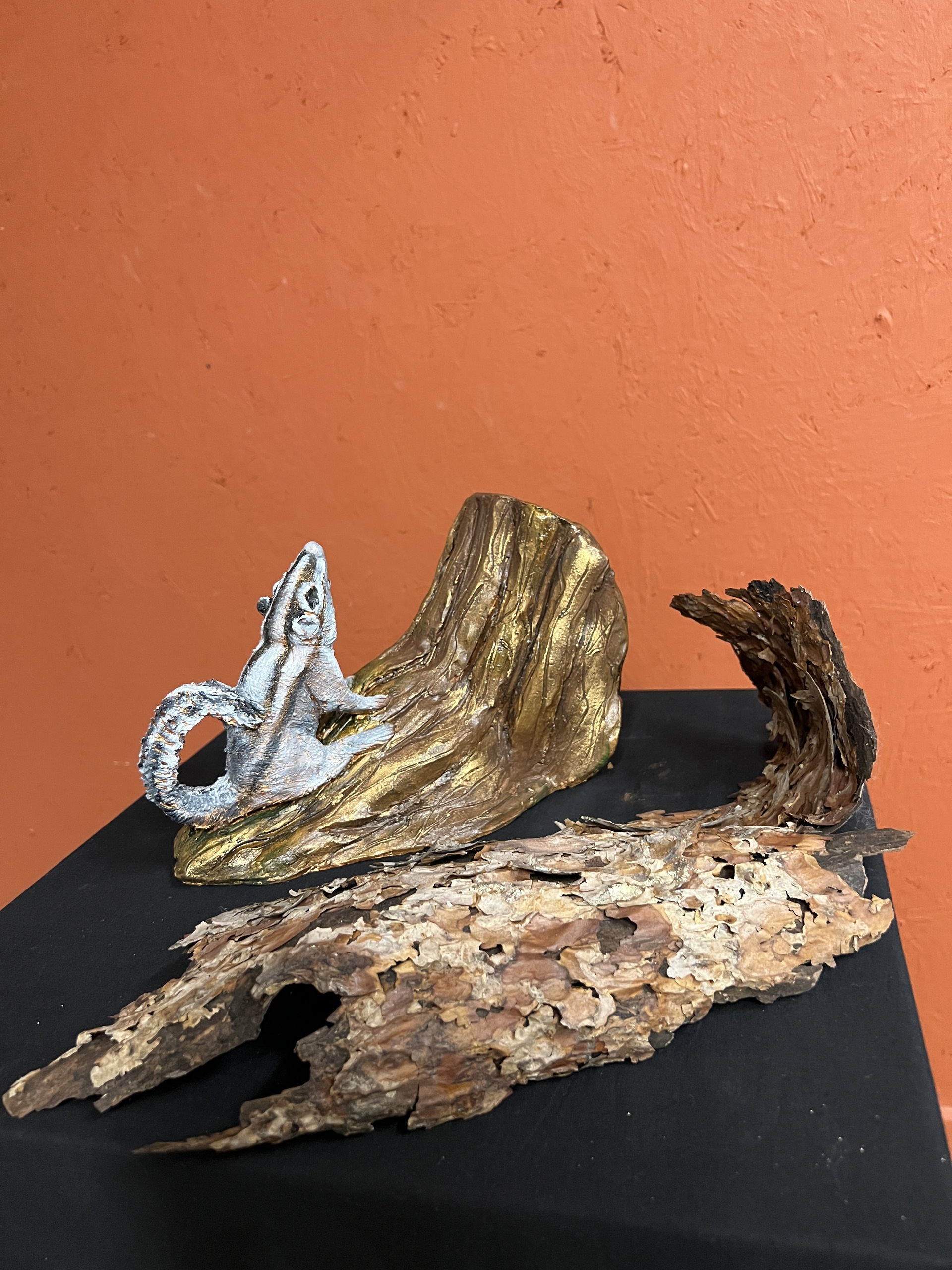 Siberische eekhoorn op een boomstam, Gemaakt van keramiek, na het bakken gewerkt met acryl en olieverf op waterbasis en hierna gepatineerd. De eekhoorn zoek voedsel voor de winter en verstopt die in de boom. Hoogte 15 cm x lengte 24 cm breedte 14 cm. Gewicht 1,3 kg