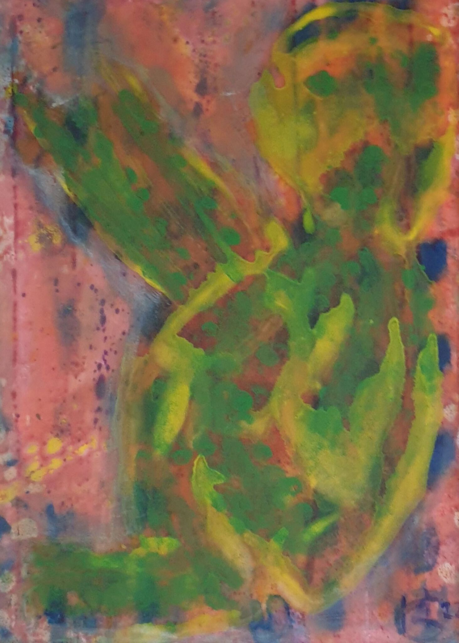 Een abstraherend schilderij geinspireerd op de oorsprong (embryo's). Het wordt ingelijst geleverd
