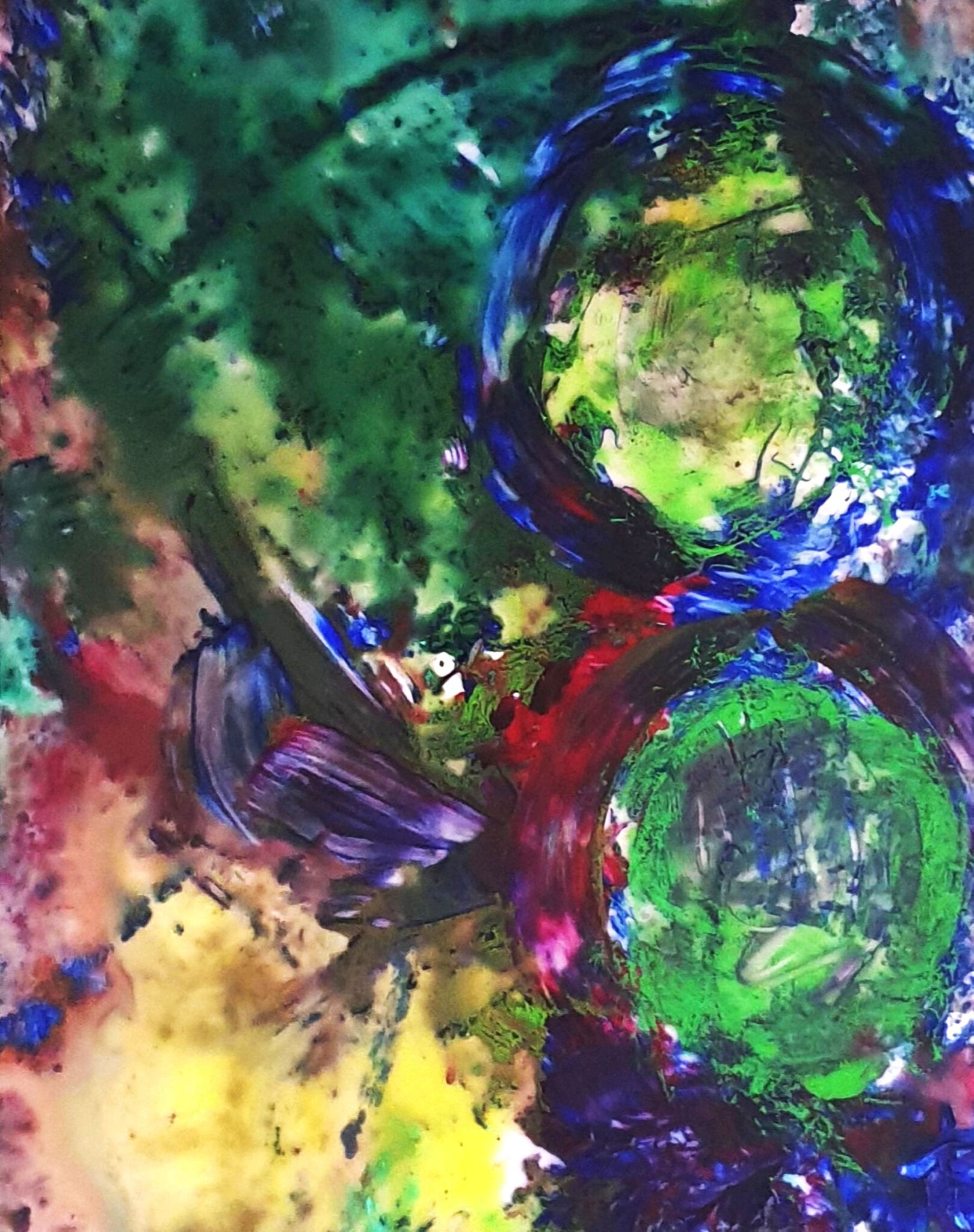 Een abstraherend schilderij geinspireerd op de oorsprong (embryo's). Het wordt ingelijst met passepartout geleverd.