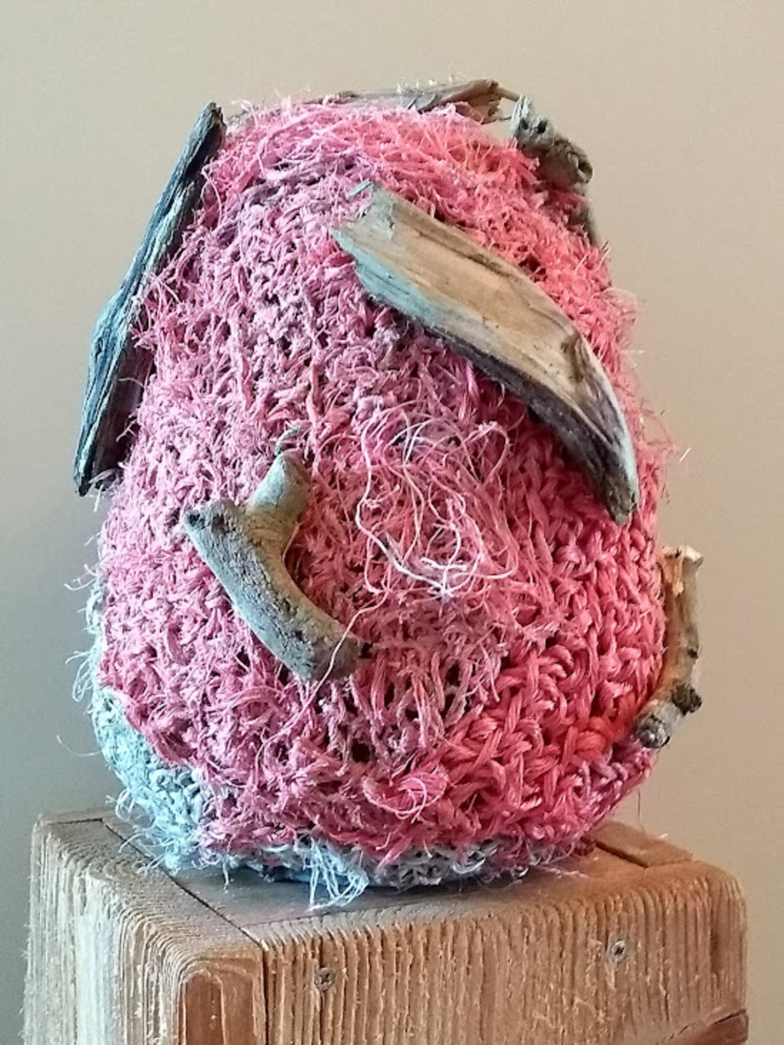 een object gehaakt van uitgeplozen scheepstouw. Alle mateiraal is gevonden bij het jutten langs Het Scheur. het object is opgepimpt met drijfhout