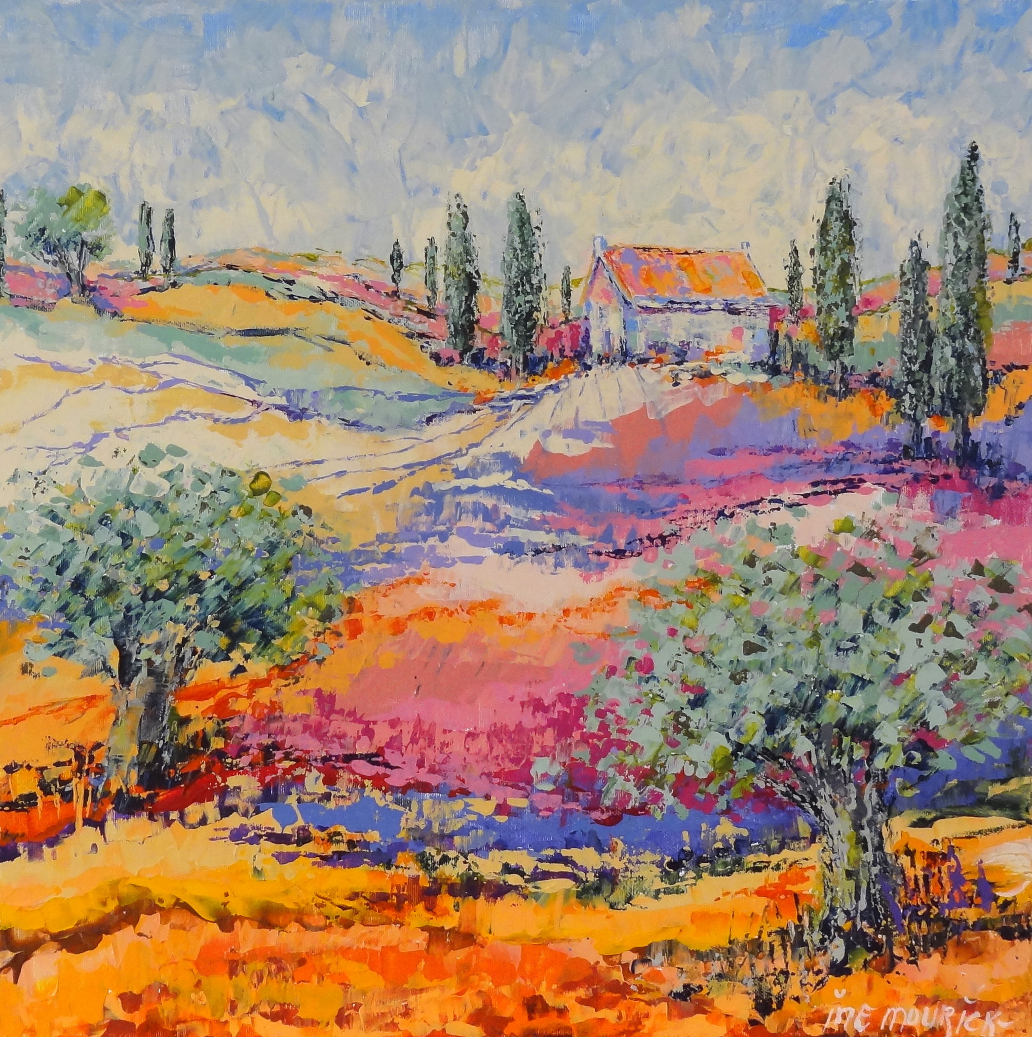 Expressief- zuidelijk landschap in zomerse kleuren, met een huis op een heuvel. Het oude witte huis is omgeven door een kleurrijke bloementuin, lijfbomen en cipressen. Mijn inspiratie: de zuidelijke landschappen in de zomer, zoals in Italië, Spanje of Frankrijk en de intense kleuren van deze landschappen. Het schilderij is ingelijst. De kleuren van de houten lijst zijn zwart en zilver.