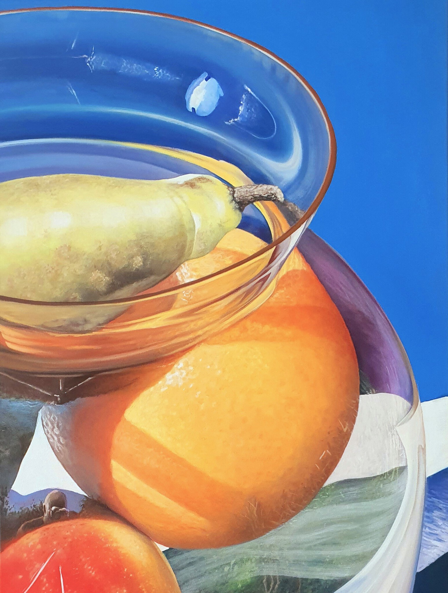Detail vaas met fruit. In de reflectie op het glas een selfie te zien.