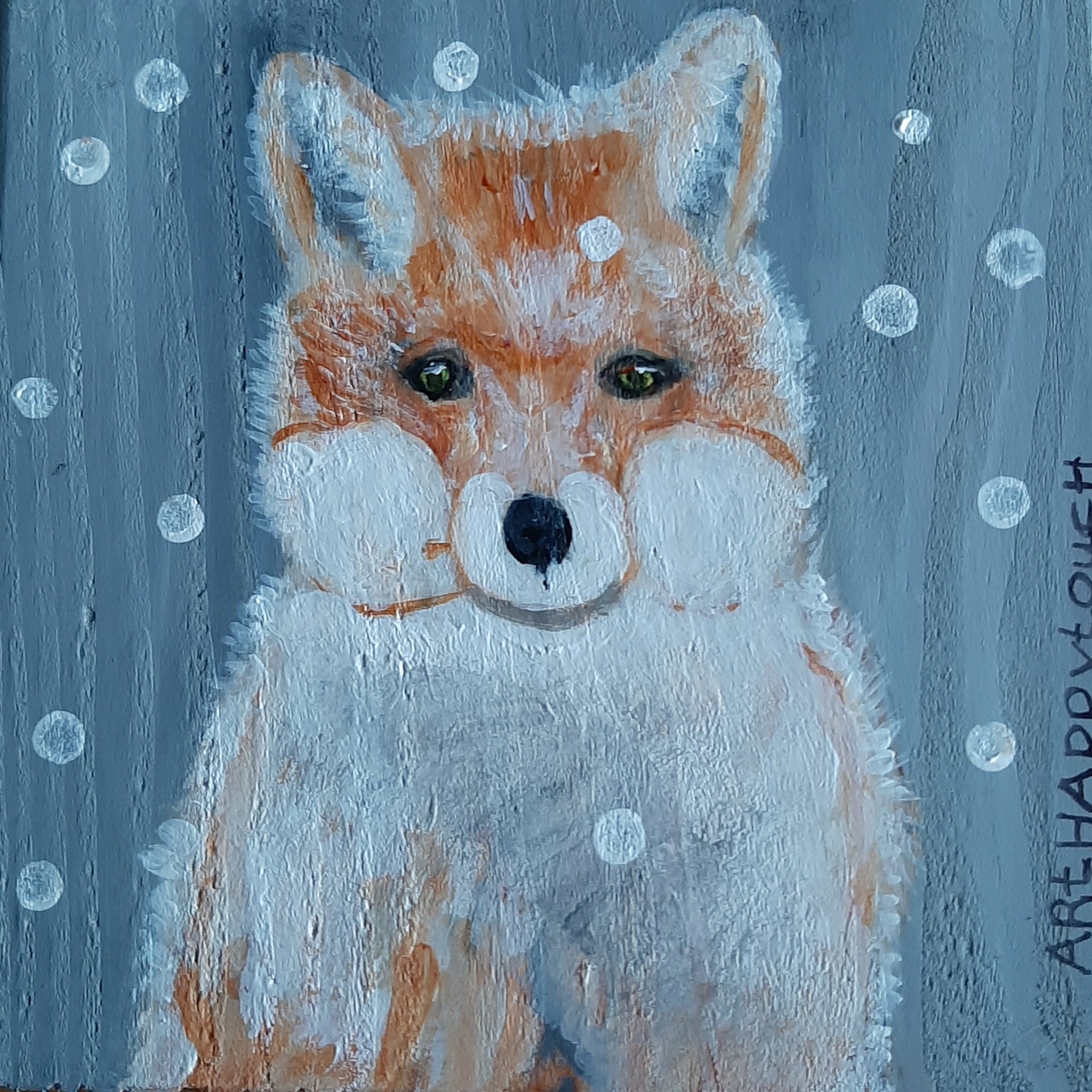 Mooi vosje in de sneeuw handgeschilderd op hout in acryl