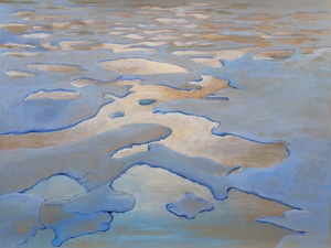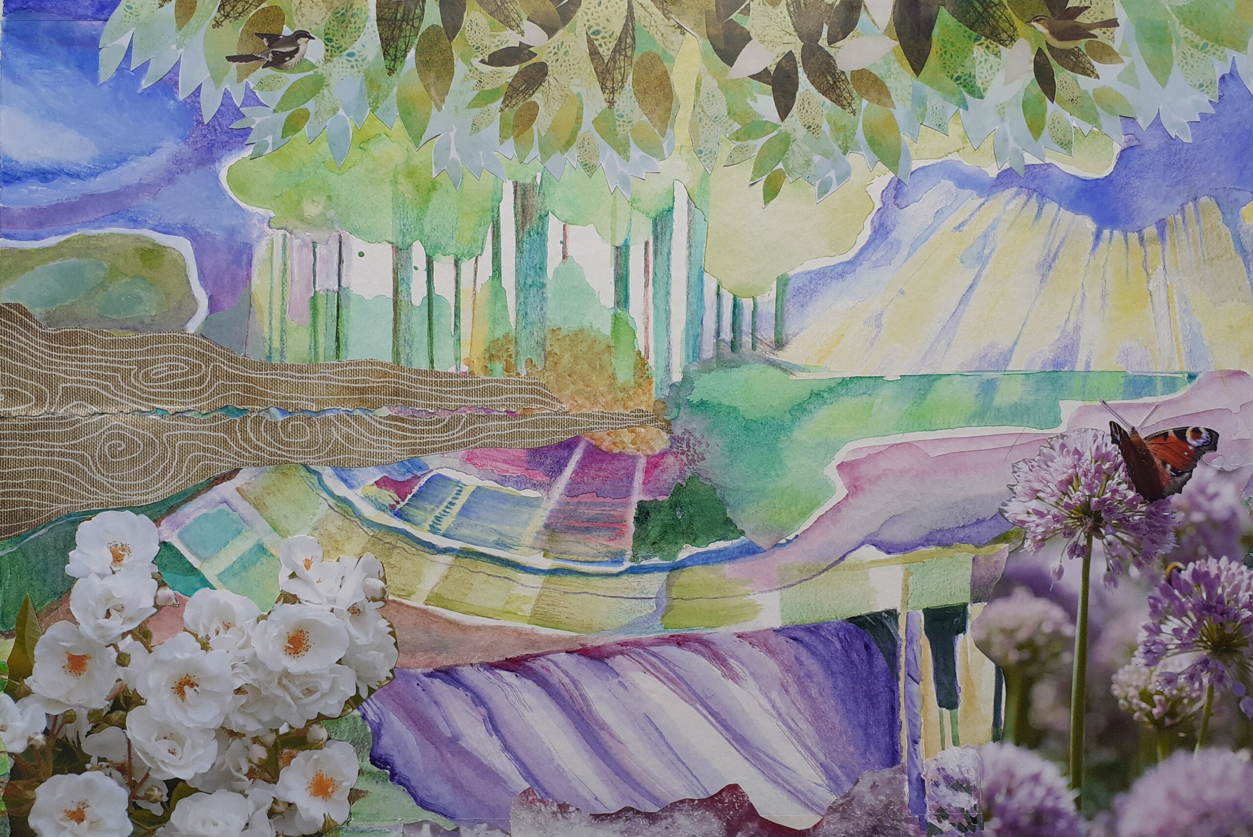 Fantasie-landschap in acrylverf, gecombineerd met fotocollage