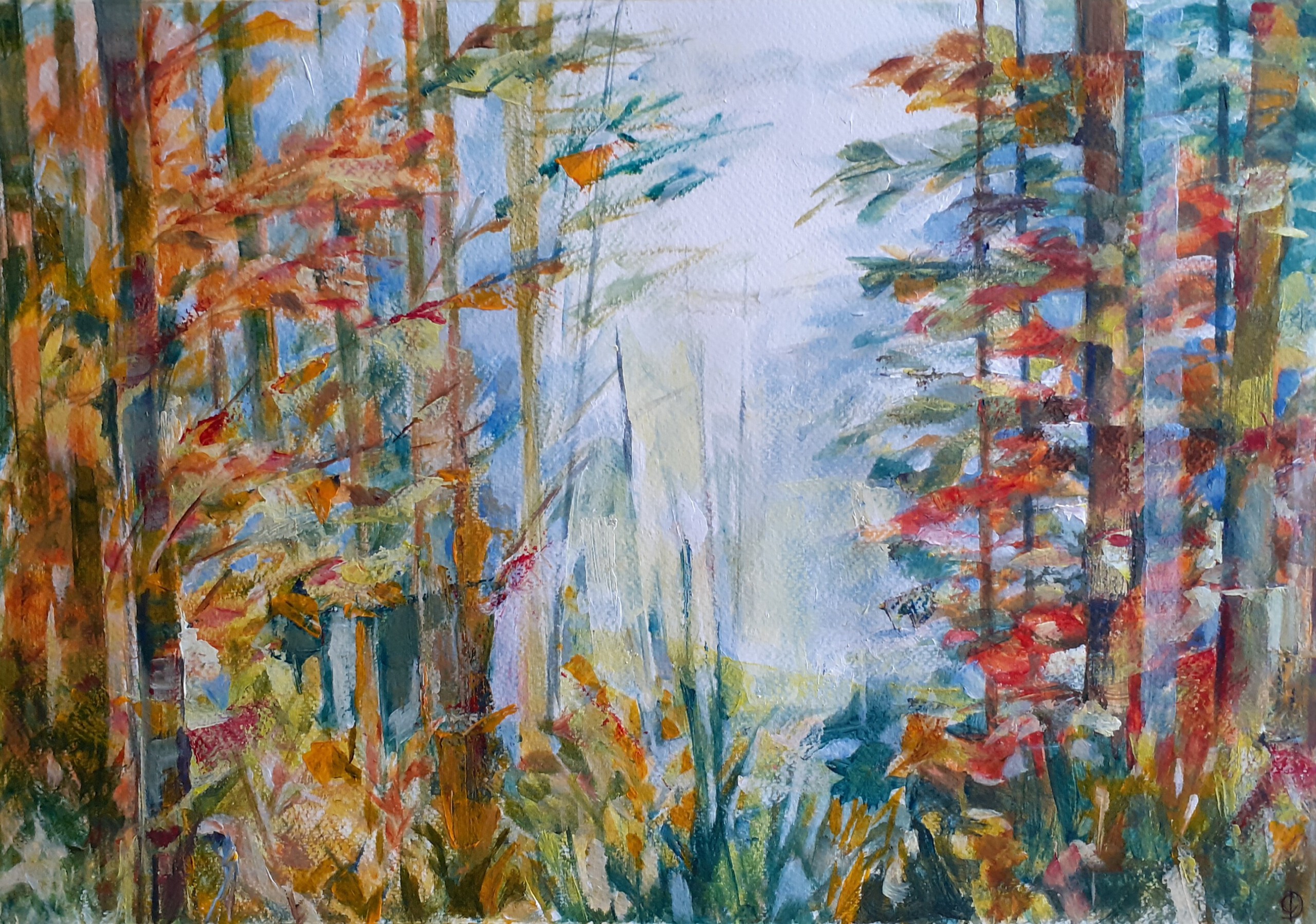 Acrylverf, gecombineerd met olieverf. In herfsttinten