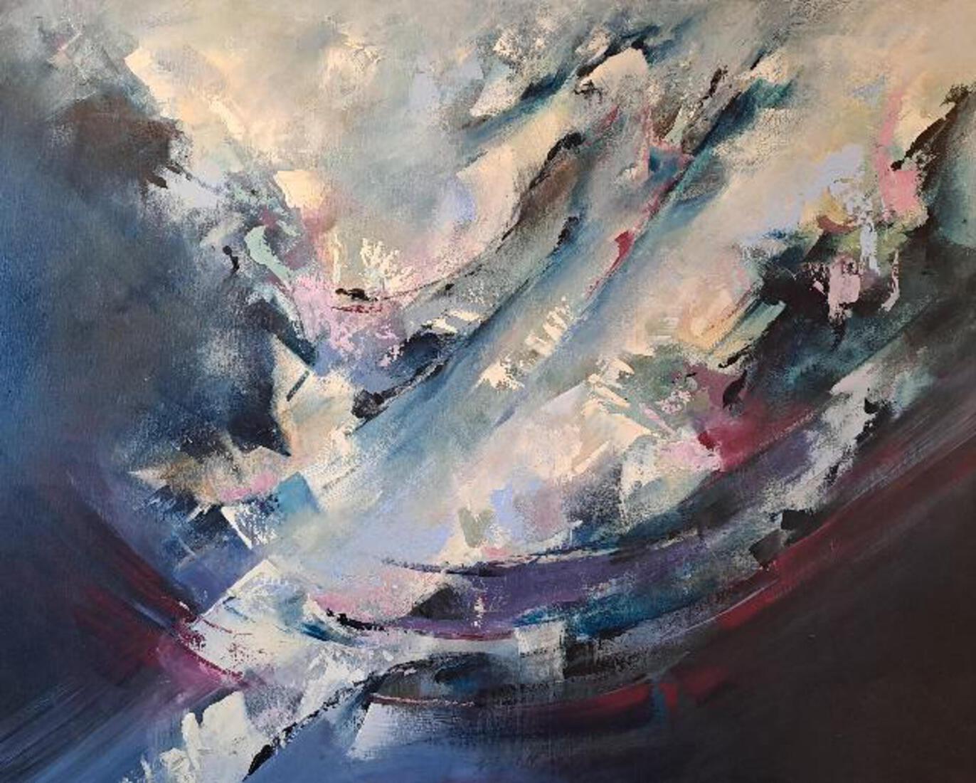 Acrylverf op doek, blauw, paarstinten en lichte accenten