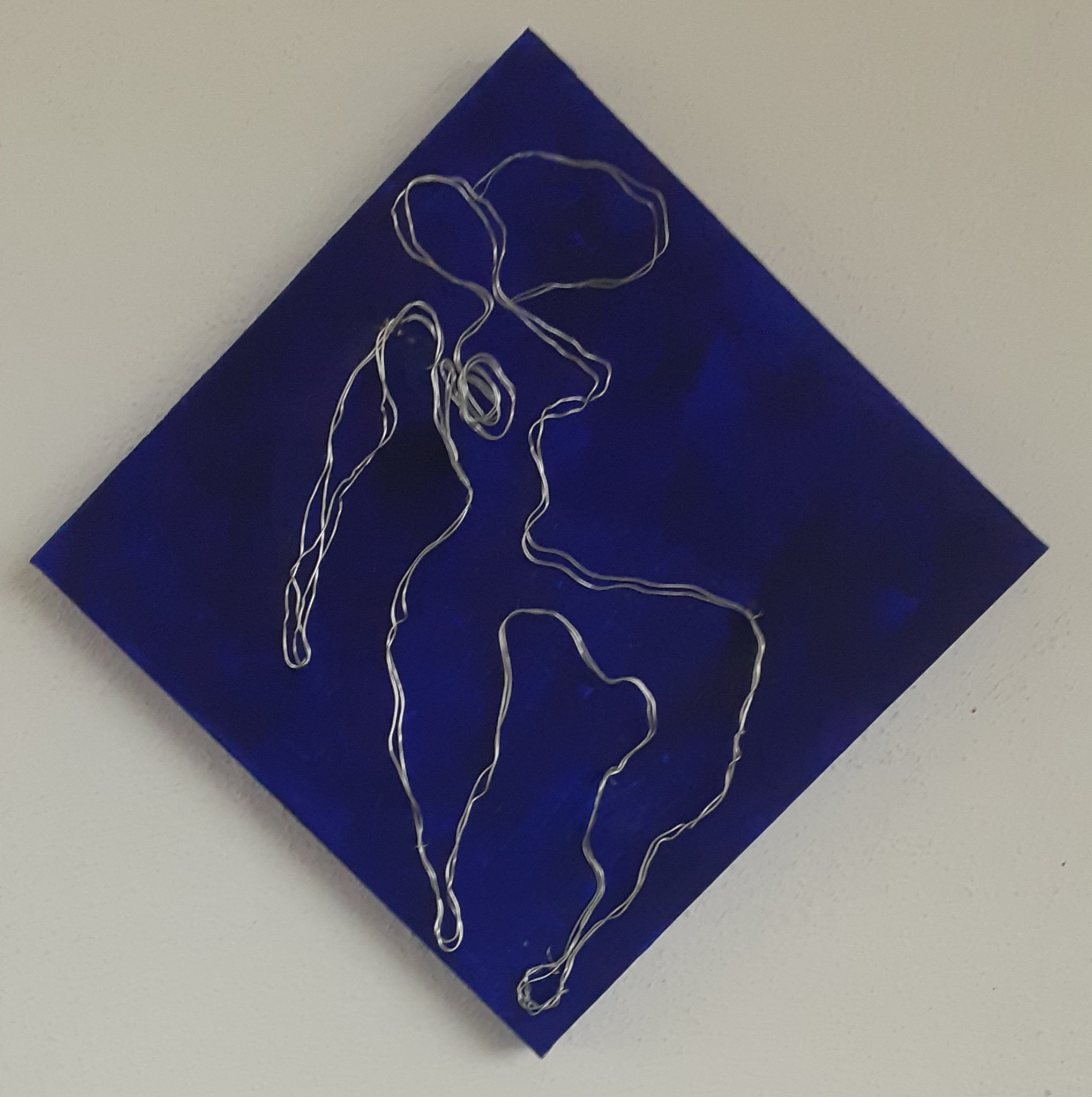 Vrouwenfiguur van ijzerdraad en acryl op doek