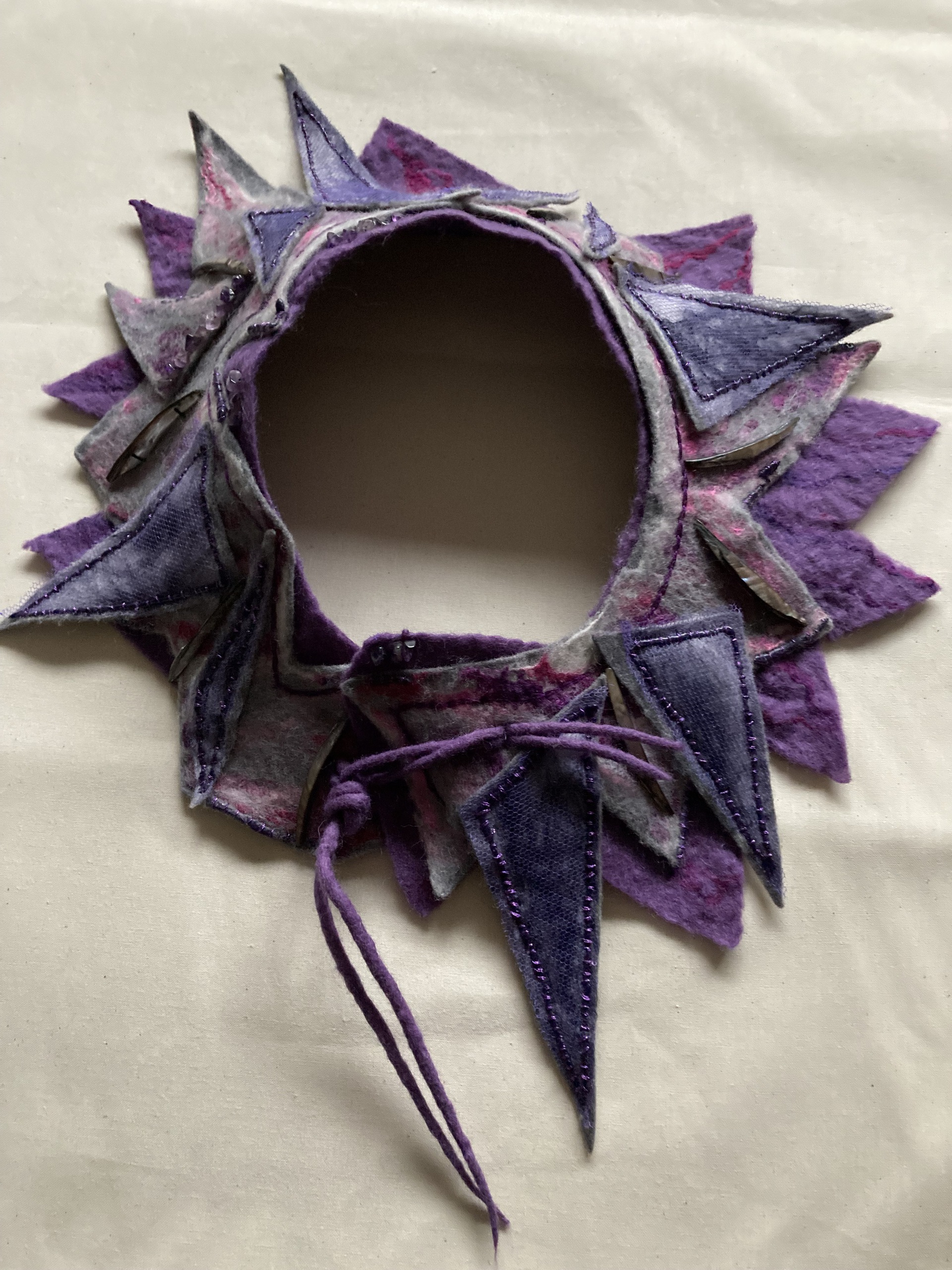 Kraag/schoudersieraad handgevilt wol/zijde/vloeibaarrubber/tule/natuurstenen kraaltjes