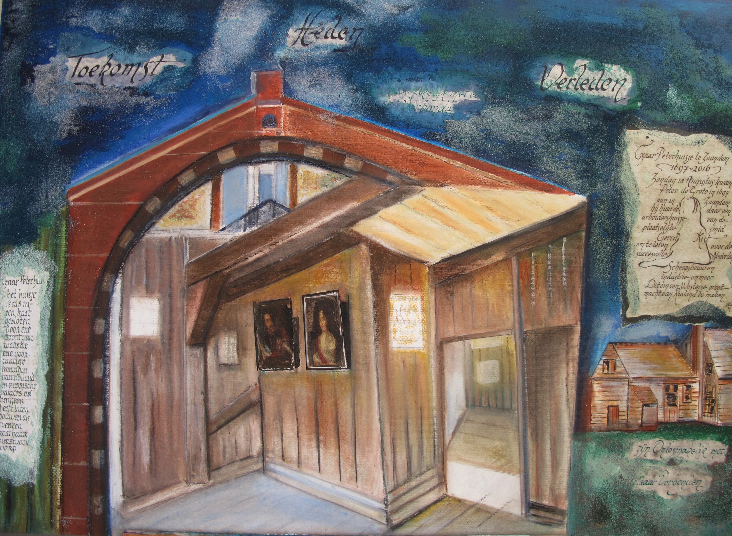 Mijn impressie van het Czaar Peter Huisje in Zaandam, met kalligrafie. Oud en nieuw ontmoeten elkaar op dit schilderij. Heden en verleden zijn onlosmakelijk met elkaar verbonden. Geschilderd op hout met acrylverf, zand, oost-indische inkt, tekst foto's op rijstpapier. Gekalligrafeerde uitleg wordt gratis bij het schilderij geleverd.