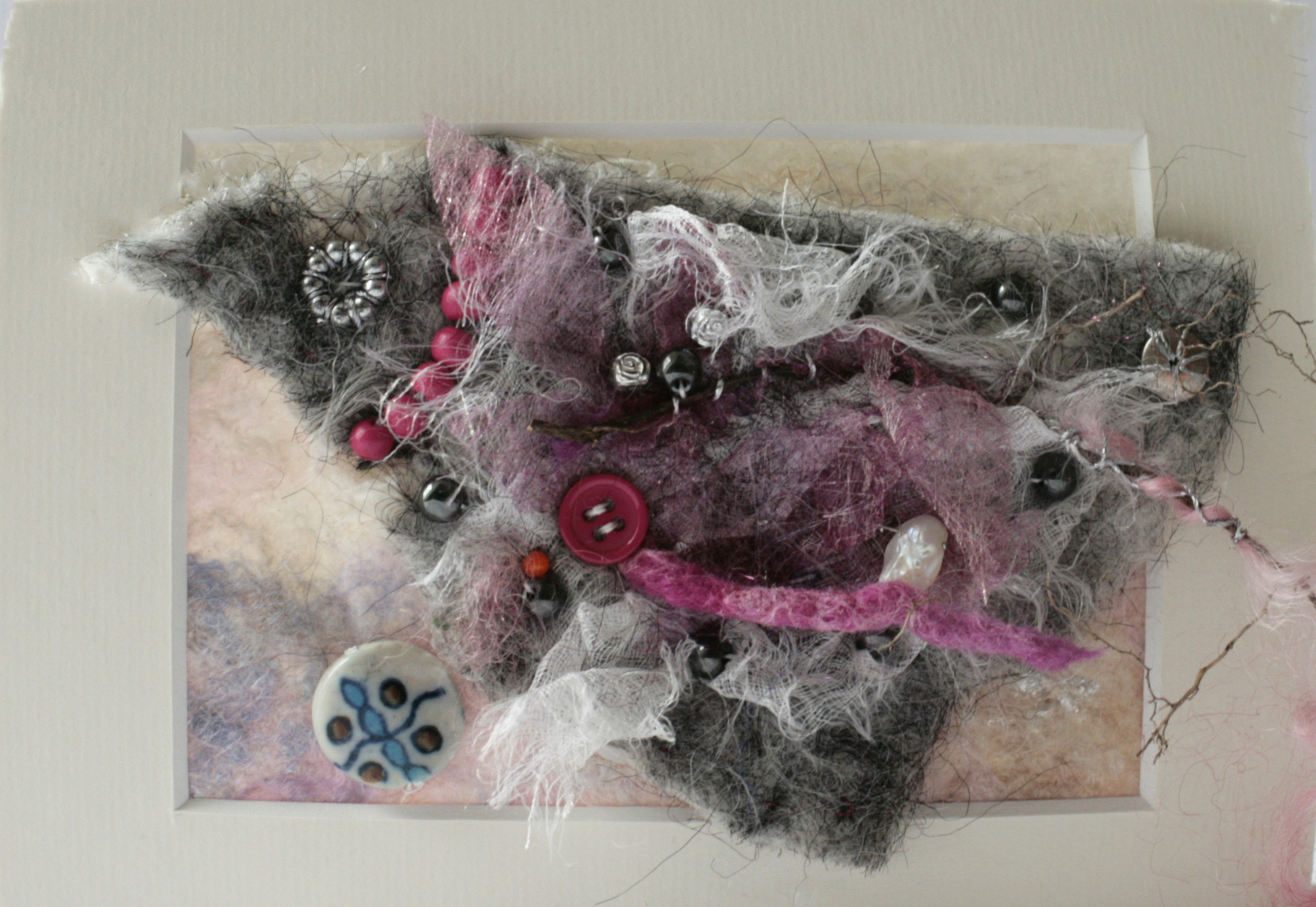 Vogel / textiel / passepartout Gemaakt op een basis van vilt met diverse decoratie van stof/zijde/kralen/draadjes/borduurwerk Ingelijst in passe-partout. Binnenmaat passe-partout 12,5 x 8,5 cm