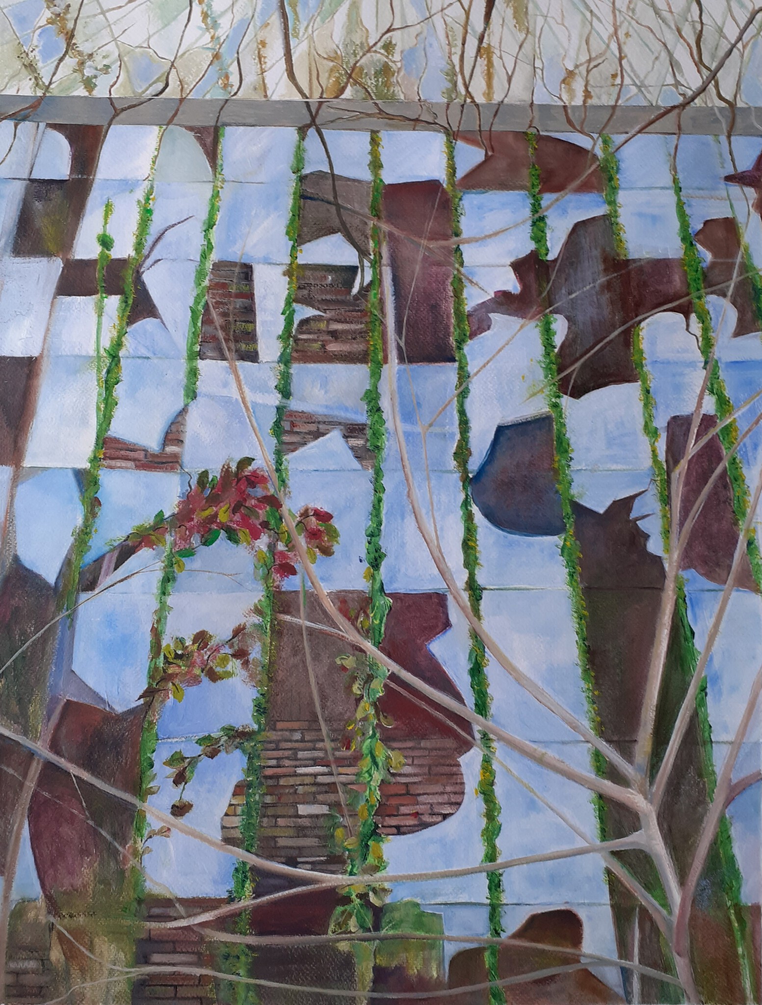 Bij het kasteel van Wippelgem staat een vervallen kas, waar de planten en bomen bezit van hebben genomen. Acrylverf gecombineerd met olieverf. Eerste deel van een 3-luik met als thema "de vervallen kas".