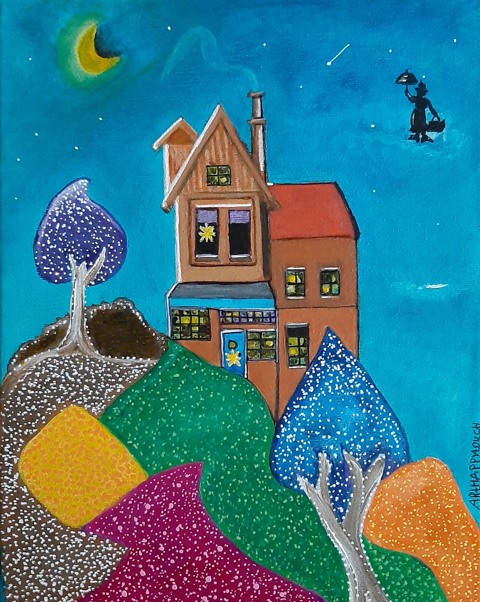 Huis Maan Kleurrijk Nacht Vrolijk Blij Schilderijtje Mary Stippels Happy Tuintje Villa Poppins Berg