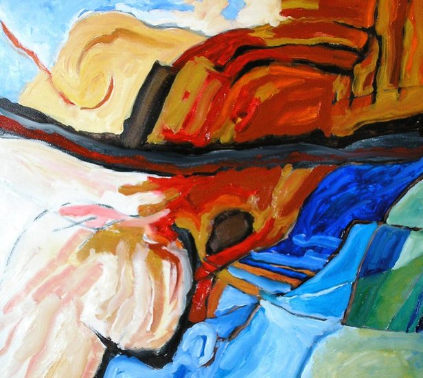 een landschap met daarin de elementen lucht land (rots)en water.
