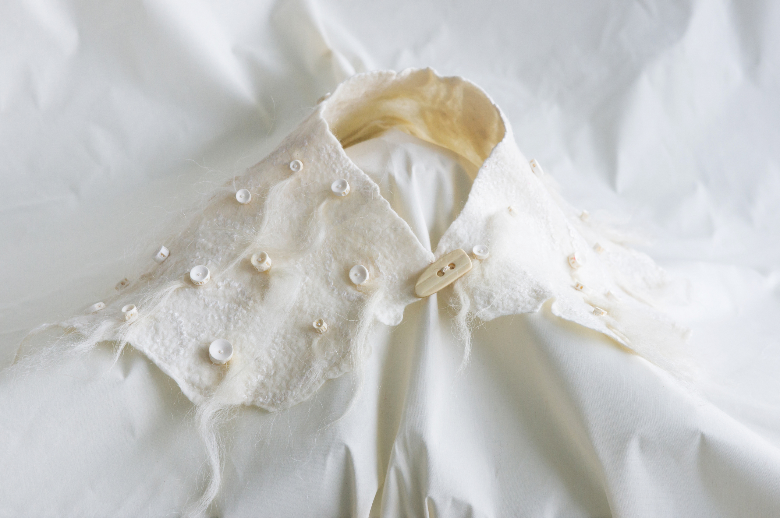 Kraag "De Bron" is mijn eerste kraag, gemaakt van wol en zijde , gevilt, geborduurd met roggewervels en kraaltjes. Sluiting door Knoop van been.