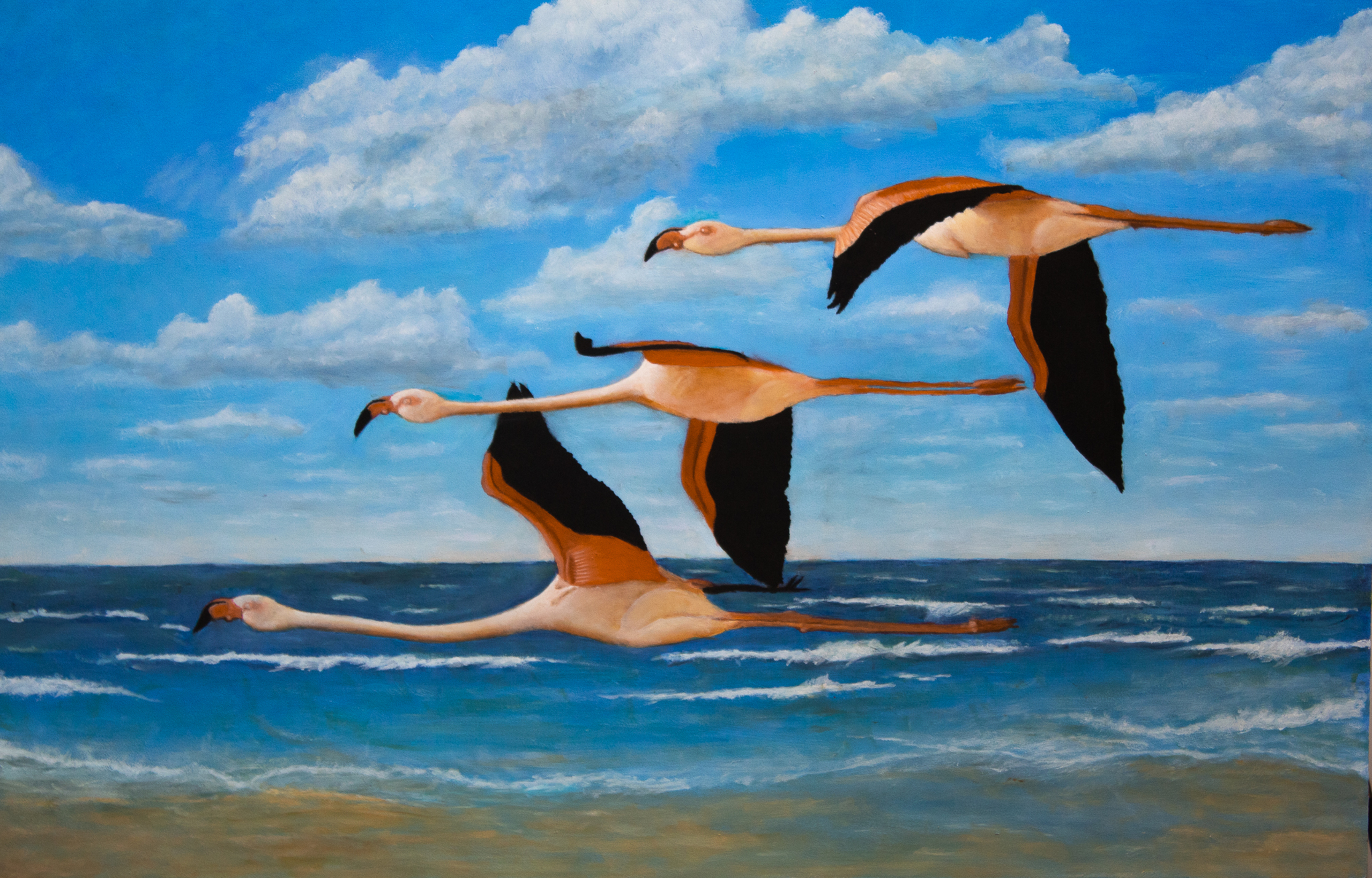 Flamingo's viegend langs de vloedlijn