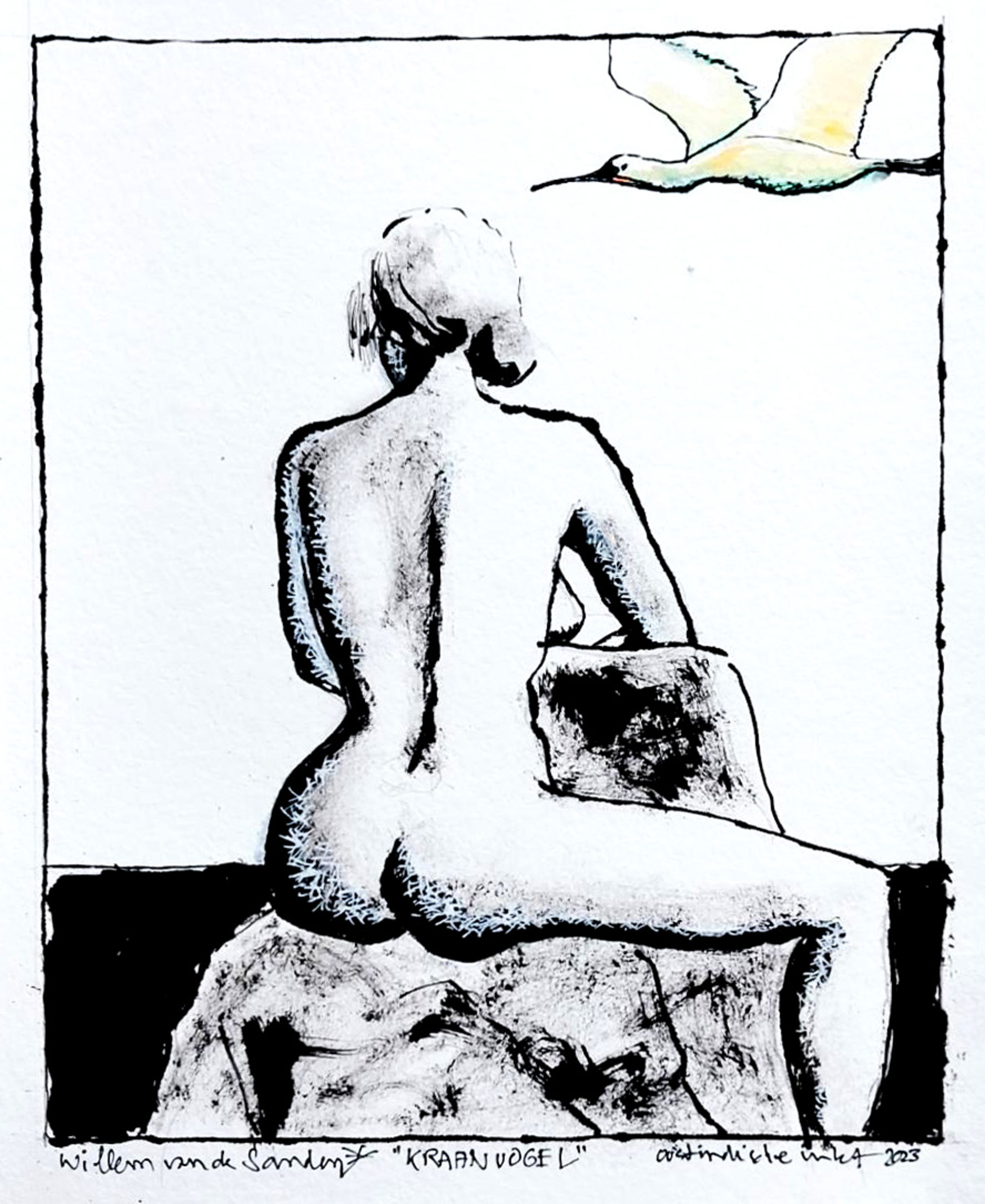 Naakte vrouw op de rug gezien en hoog in de lucht vliegt een kraanvogel. Zwart/wit prent. Oostindische inkt + waterverf.