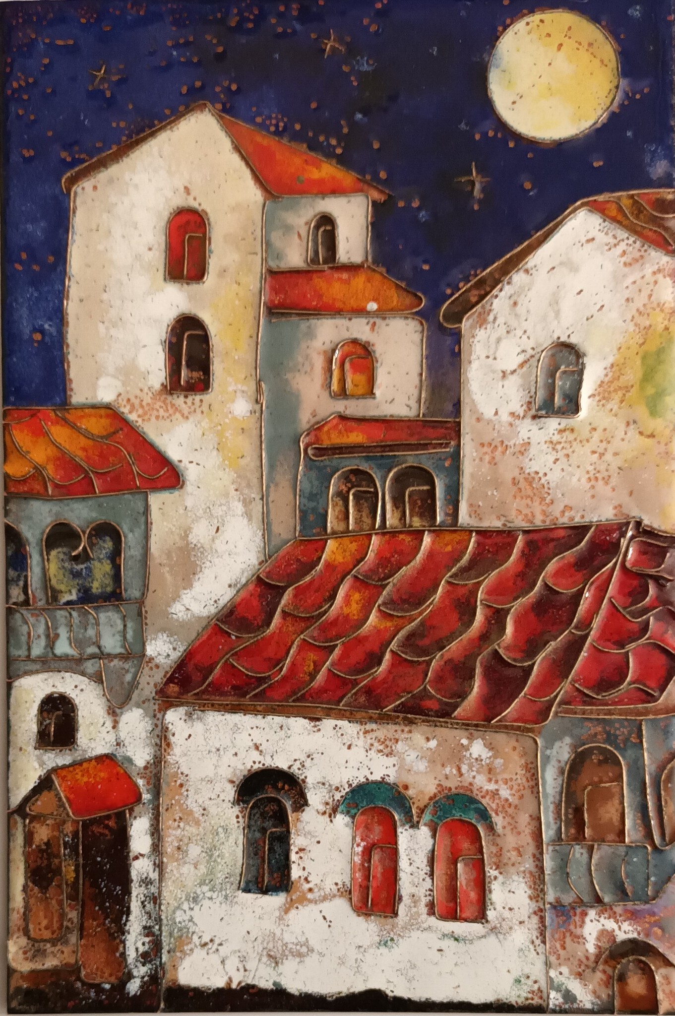 In opdracht gemaakt oud stadsgezicht (aan de hand van een foto), in emaille-cloisonné-techniek.