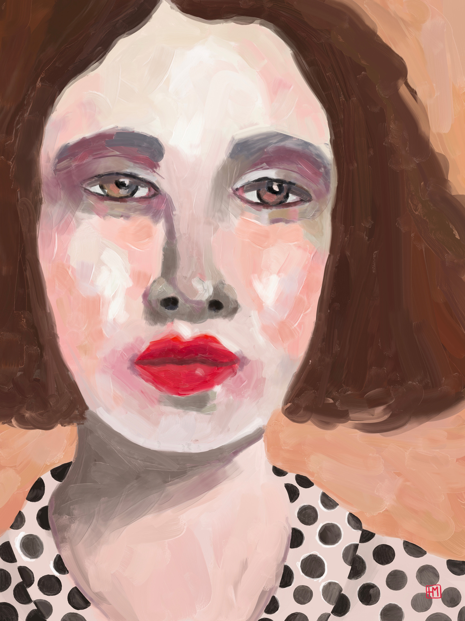 Krachtige vrouw portret met een polka dot overhemd. Abstract fantasie schilderij van een vrouw met zalmrose achtergrond. Dit schilderij maakt deel uit van een serie van 3 schilderijen, een vrouw in een gestreept overhemd, en stoere vrouw in een bloemen jurk. Ik schilder dieren, mensen en objecten uit het dagelijks leven. Ik ben op zoek naar het mooiste licht en gebruik uitgesproken kleuren. U kunt dit schilderij kopen als art-print op papier, acrylglas, aluminium of hout. Op deze pagina vindt u links naar printshops in het land waar u woont. Dit schilderij is volledig digitaal gemaakt. In navolging van de geweldige kunstschilder David Hockney die als eerste een volledige tentoonstelling inrichtte met schilderijen die hij maakte op zijn i-pad. Op 85 jarige leeftijd. In 2013 in het fine art museum van San Francisco. Hij was de eerste bekende kunstschilder die de de i-pad gebruikte voor het maken van museale kunst. Gemaakt met een pen met 'olieverf' maar dan een digitale pen die de pixels op mijn i-pad aan stuurt en waarmee ik penseelstreken kan maken die niet van echt te onderscheiden zijn. Een plezier om te doen en prachtig om zelf te zien hoe mijn werk daardoor is geëvolueerd tot iets geheel nieuws. En dit nog dagelijks doet.
