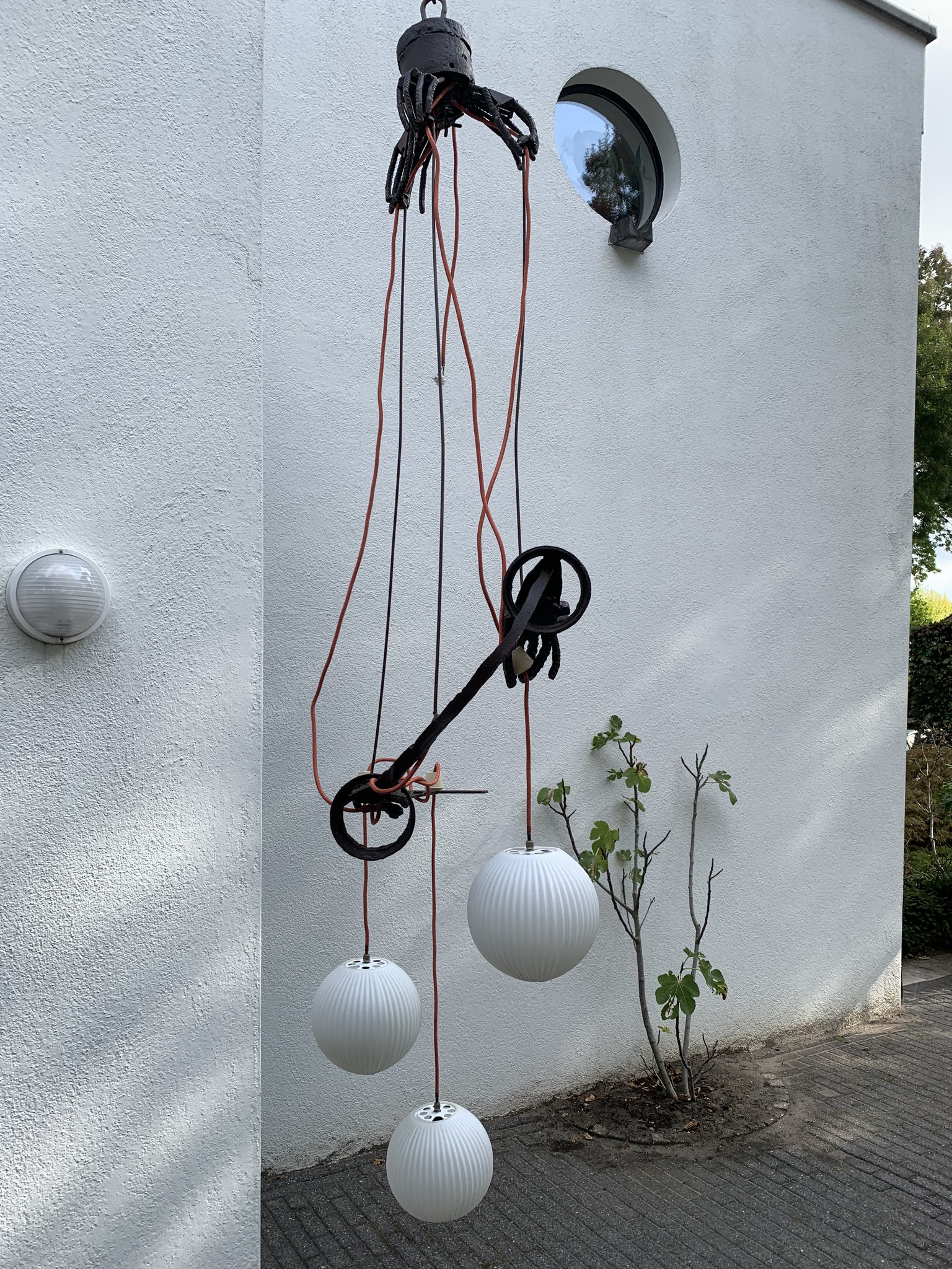 Waarom doe je wat je doet? Wie trekt er aan de touwtjes? In het licht van deze vragen kun je deze hanglamp zien. Metalen handsculpturen die drie glazen bollen in de lucht houden en licht laten schijnen