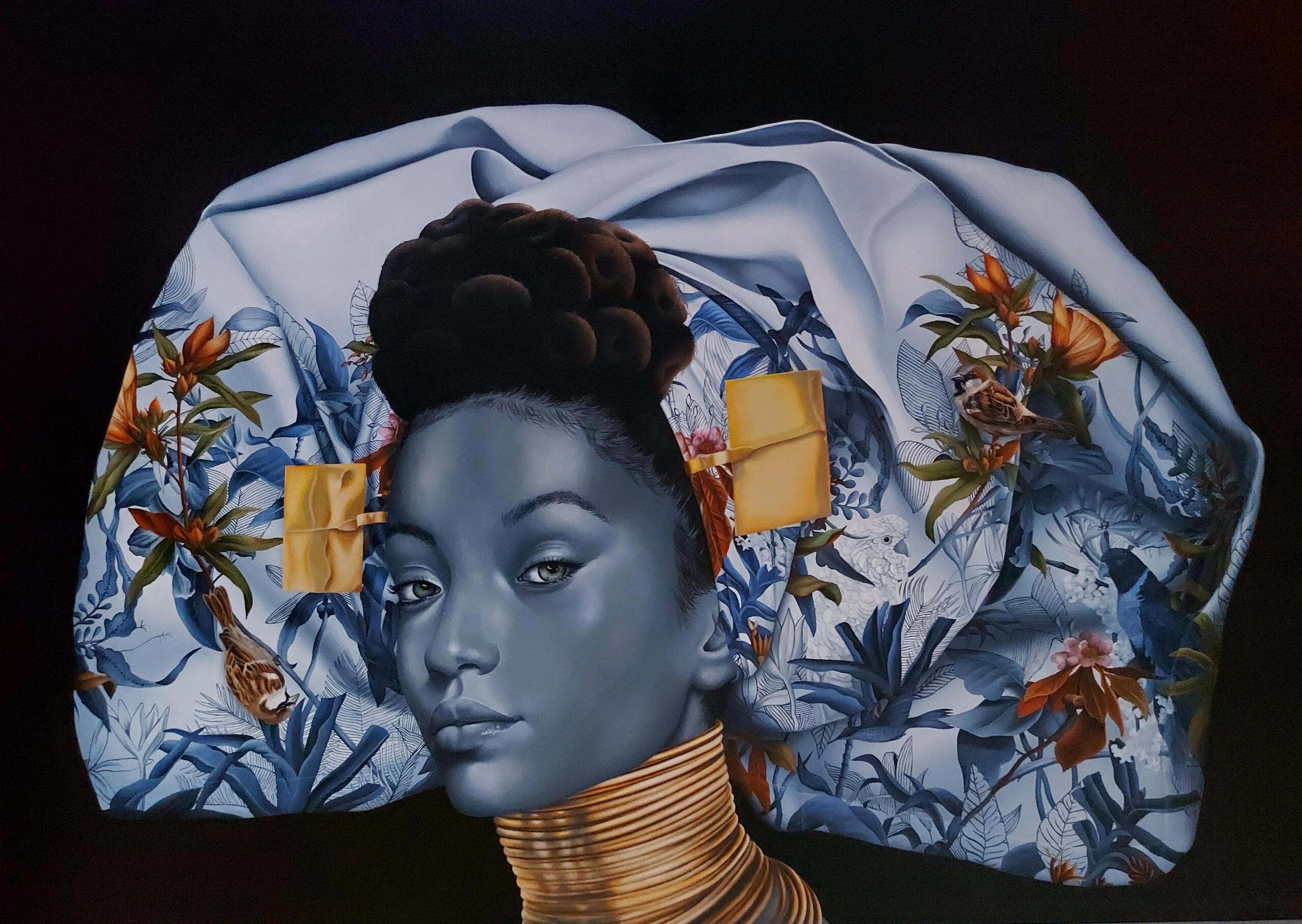 Gebaseerd op de zeeuwse klederdracht. Met name de zeeuwse kap. Vanwege de diversiteit in Nederland heb ik ervoor gekozen om de typisch nederlandse hoofddracht te combineren met de nigeriaanse " Gele ". De stof is versierd met tropische bloemen en planten. De huismus en tropische vogels. Een mengelmoes van diverse culturen. Tezien bij gallerie TrésArt te Breda Verkrijgbaar als giclée