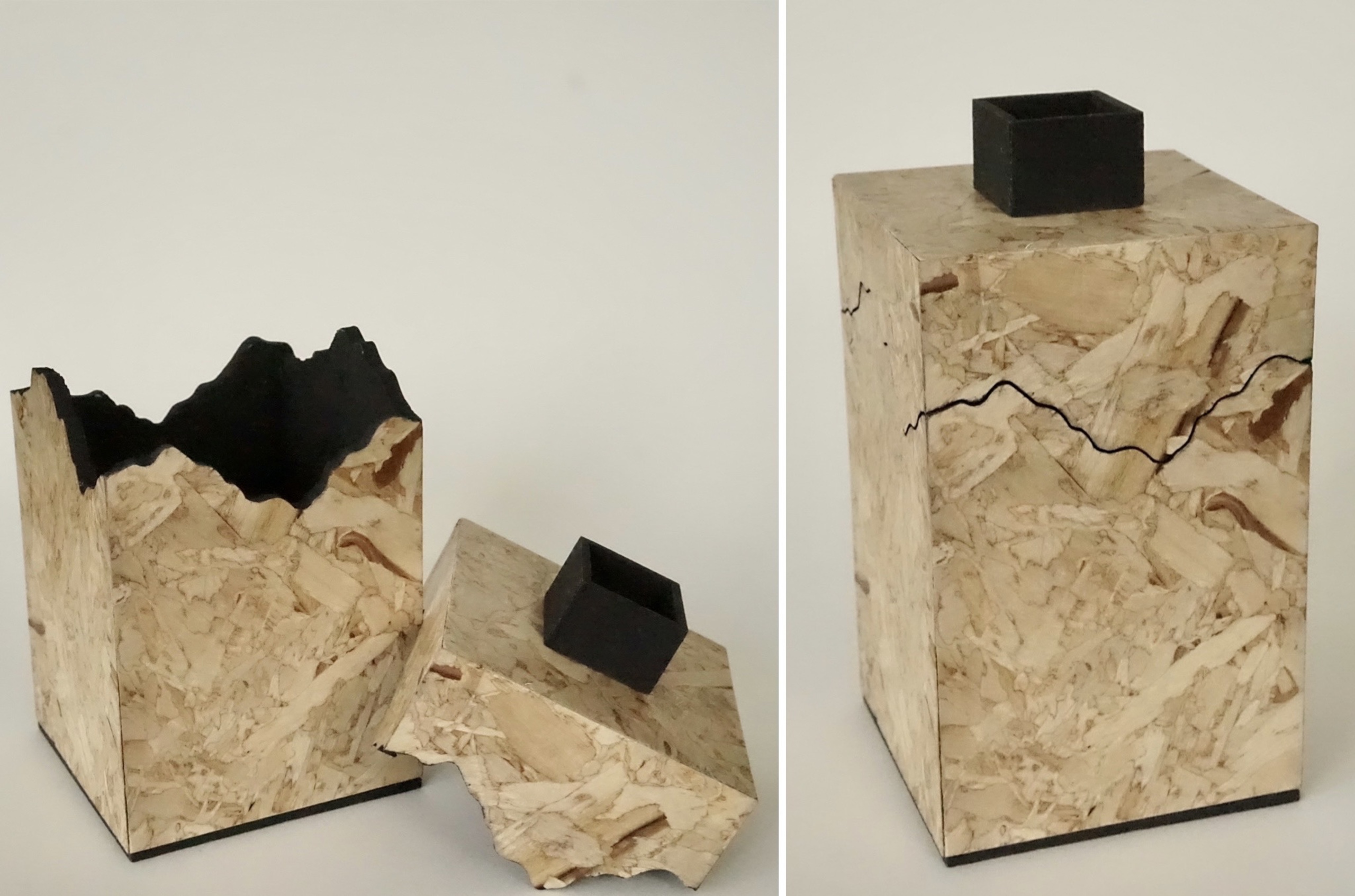 Dekseldoos van chipboard met breuklijn als sluiting.