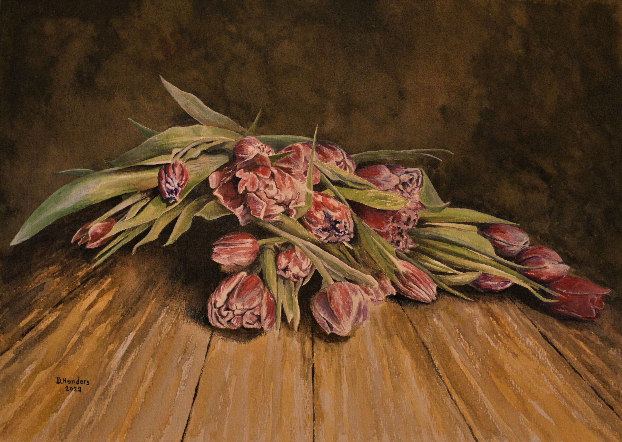 Geplukte tulpen, ze liggen klaar om in een faas gezet te worden. Ziet er zo wat rommelig maar toch ook ongerept uit op de tafel.