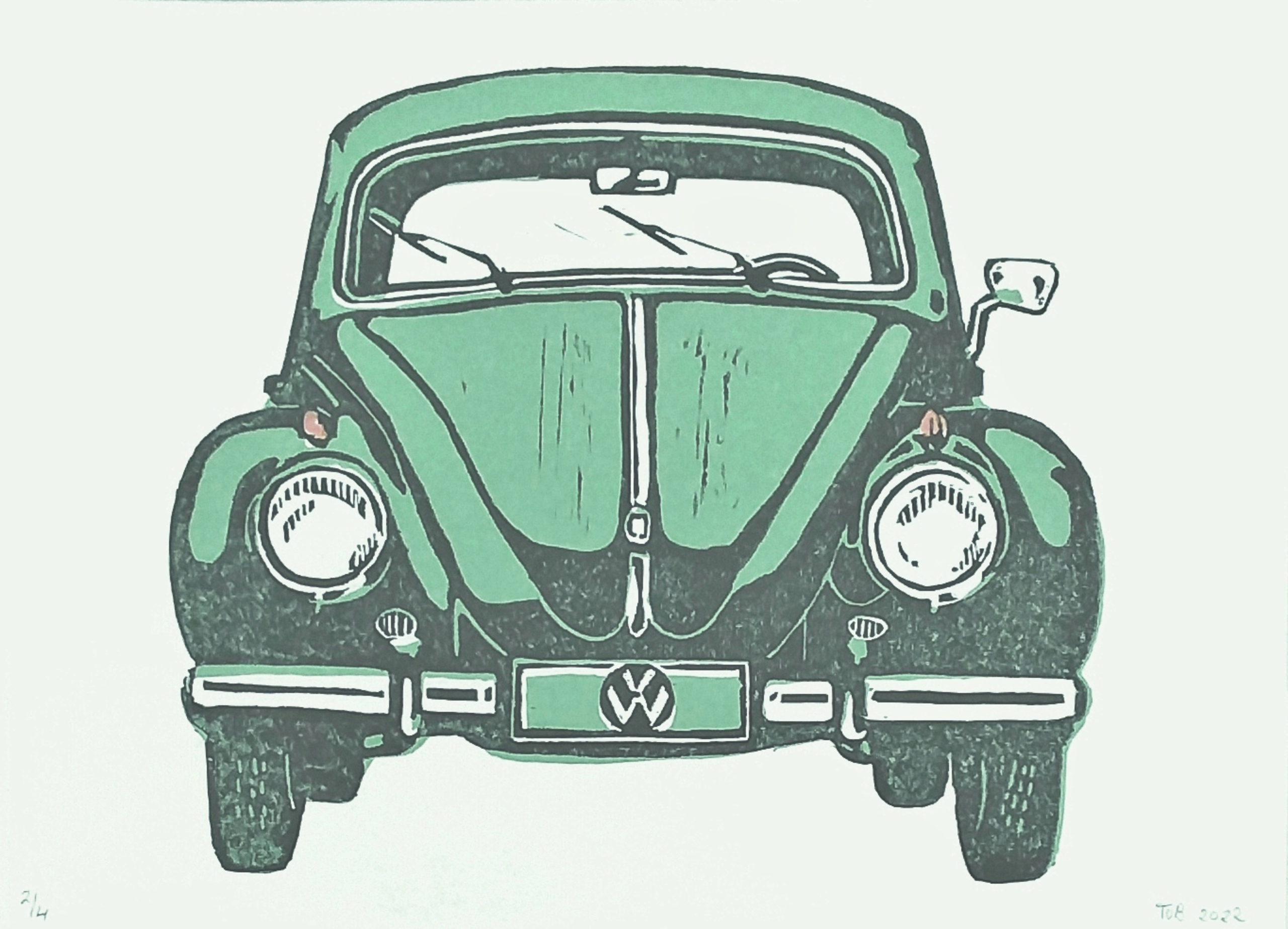 Klassieke Auto Jaren Lichtgroen Kever Vintage Vw Linosnede Kleurendruk Zestiger Automobiel Vw1200
