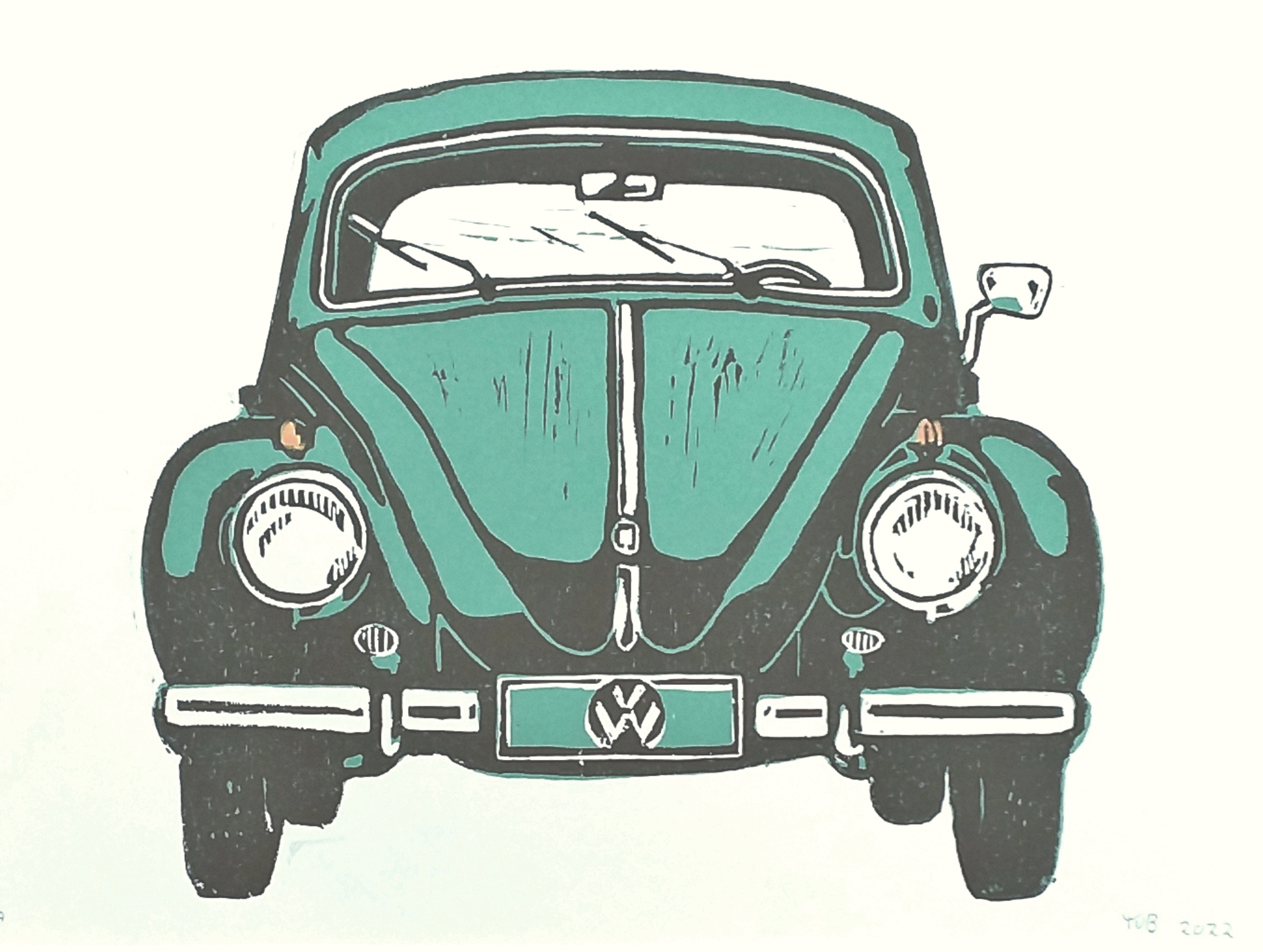 Klassieke Auto Jaren Kever Turquoise Vintage Vw Linosnede Kleurendruk Zestiger Automobiel Vw1200