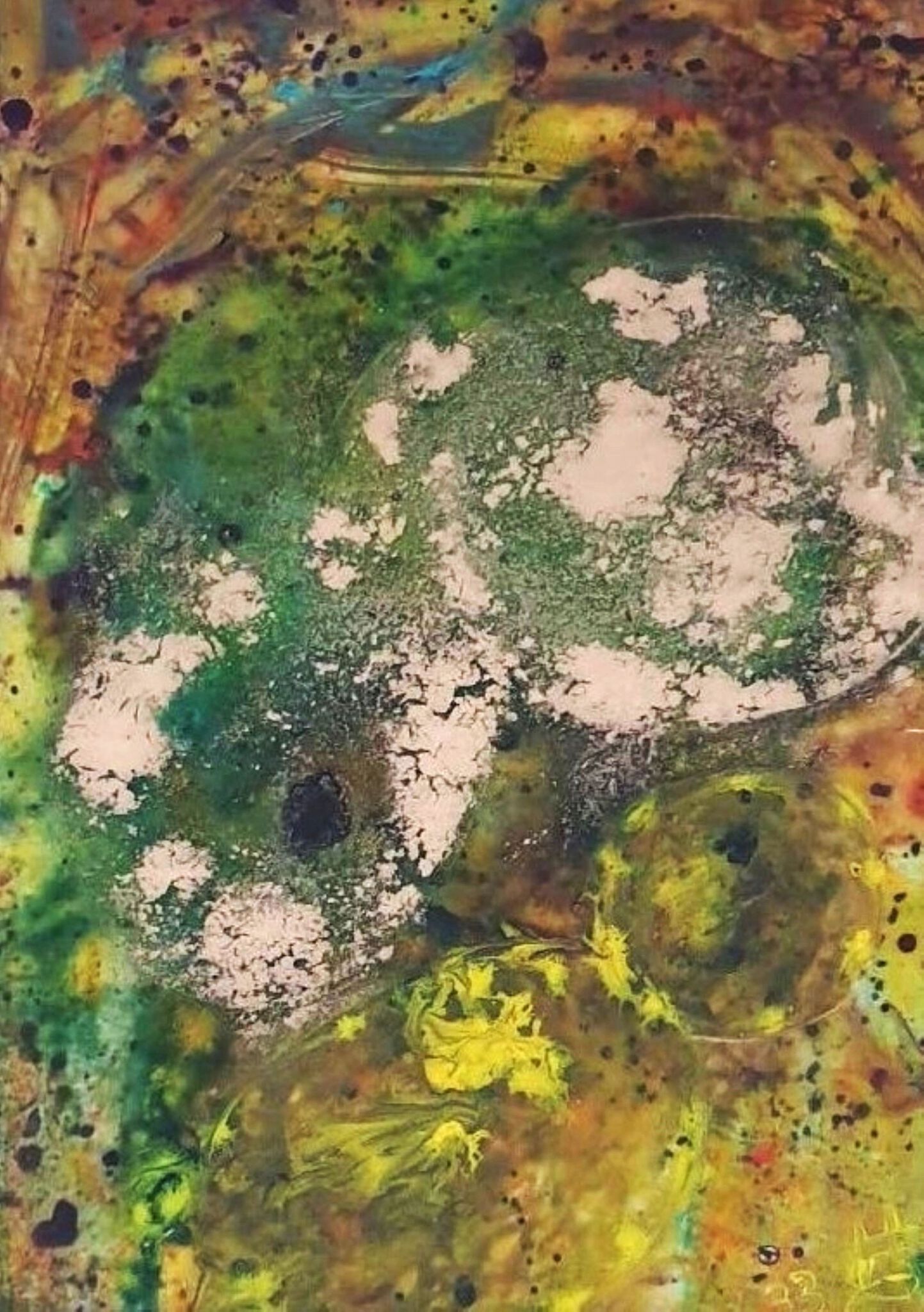 Een abstraherend schilderij geinspireerd op de oorsprong (embryo's). Het wordt ingelijst met passepartout geleverd.