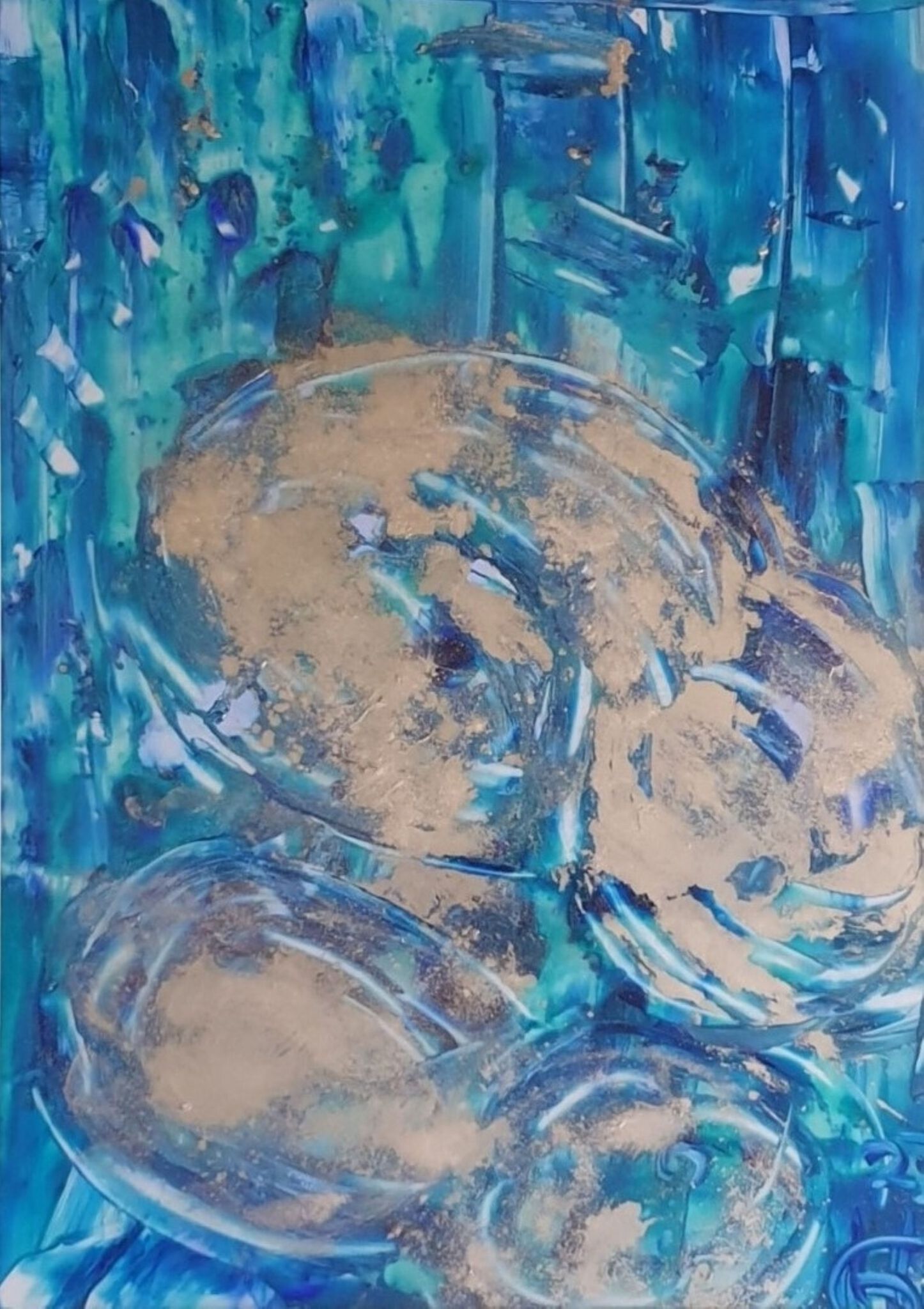 Een abstraherend schilderij geinspireerd op de oorsprong (embryo's). Het wordt ingelijst (wit) met passepartout geleverd.